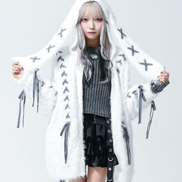 Rabbit Ear Feather Yarn Knit Zip Hoodie