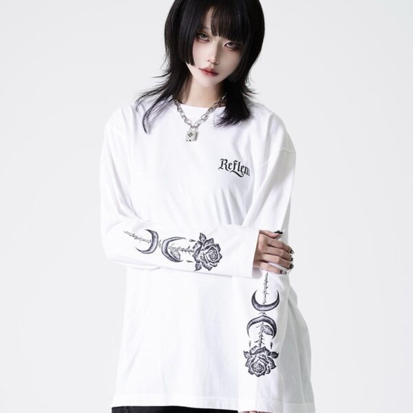 This long-sleeved T-shirt features a striking print that evokes a…$100.00 -