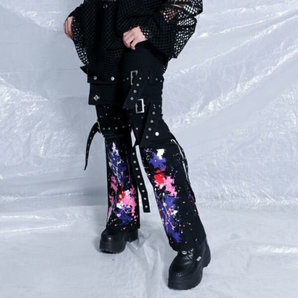Painted flared silhouette cargo pants with belts are now in…
