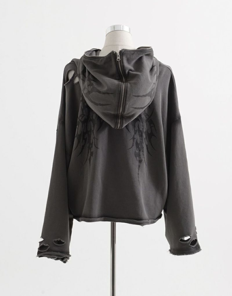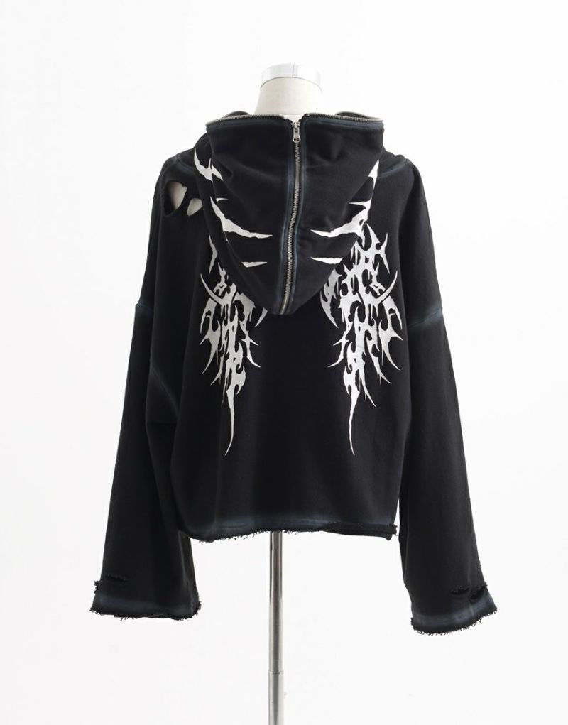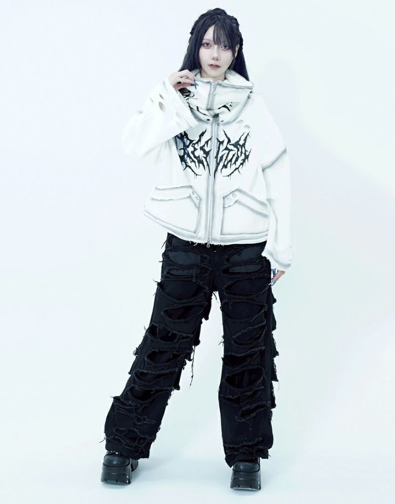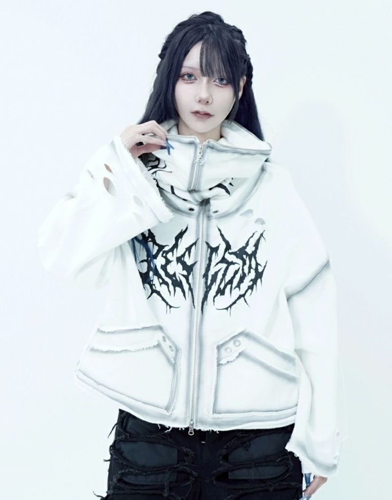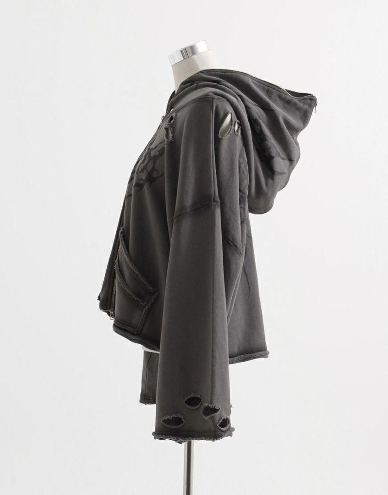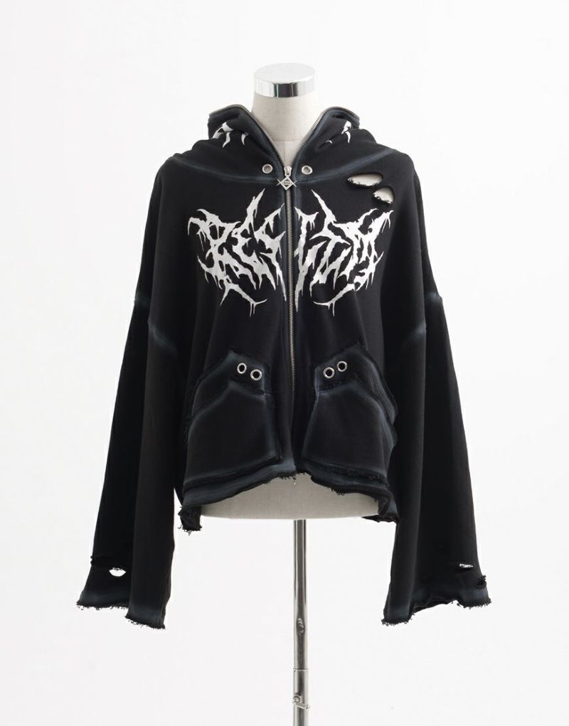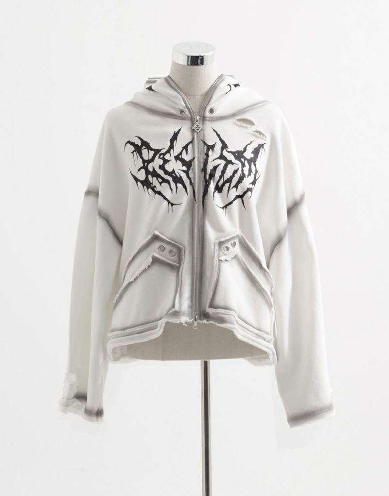 This cropped zip-up hoodie boasts an edgy design that’s characteristic of REFLEM.