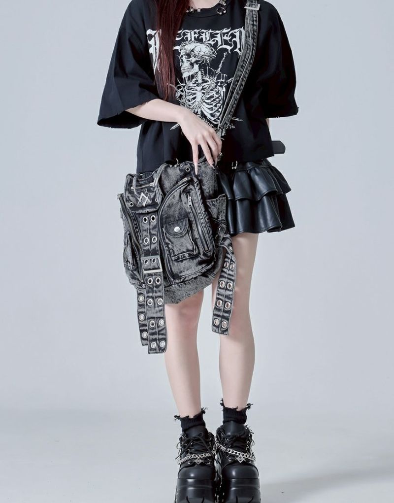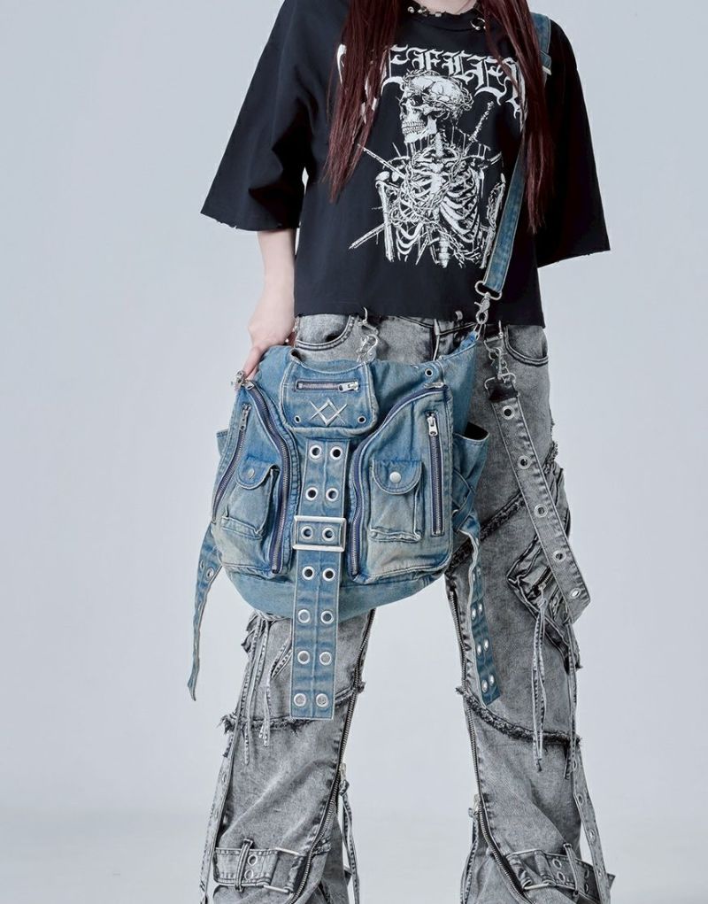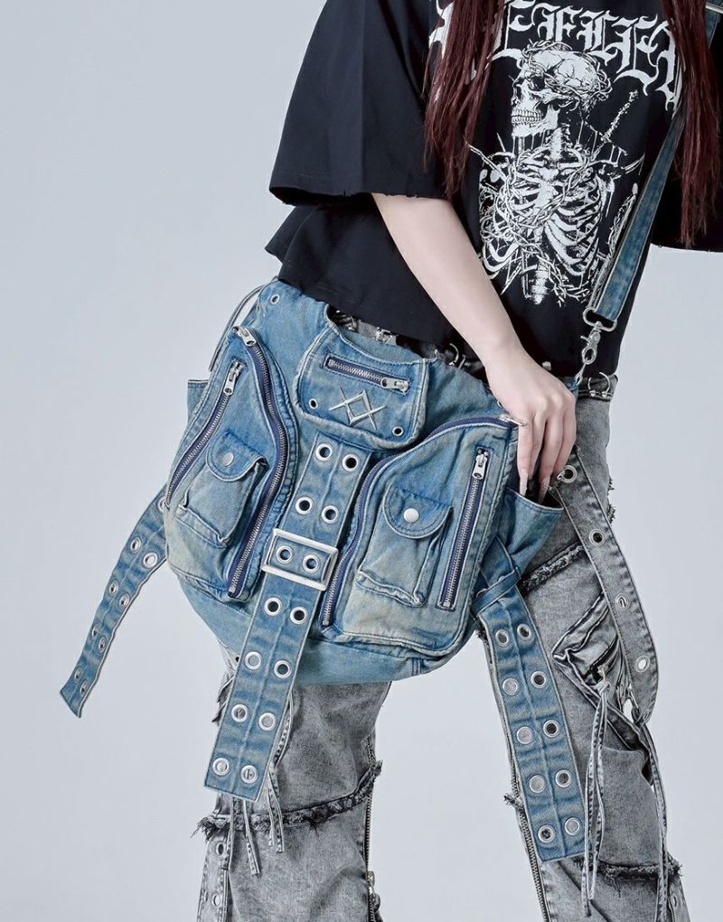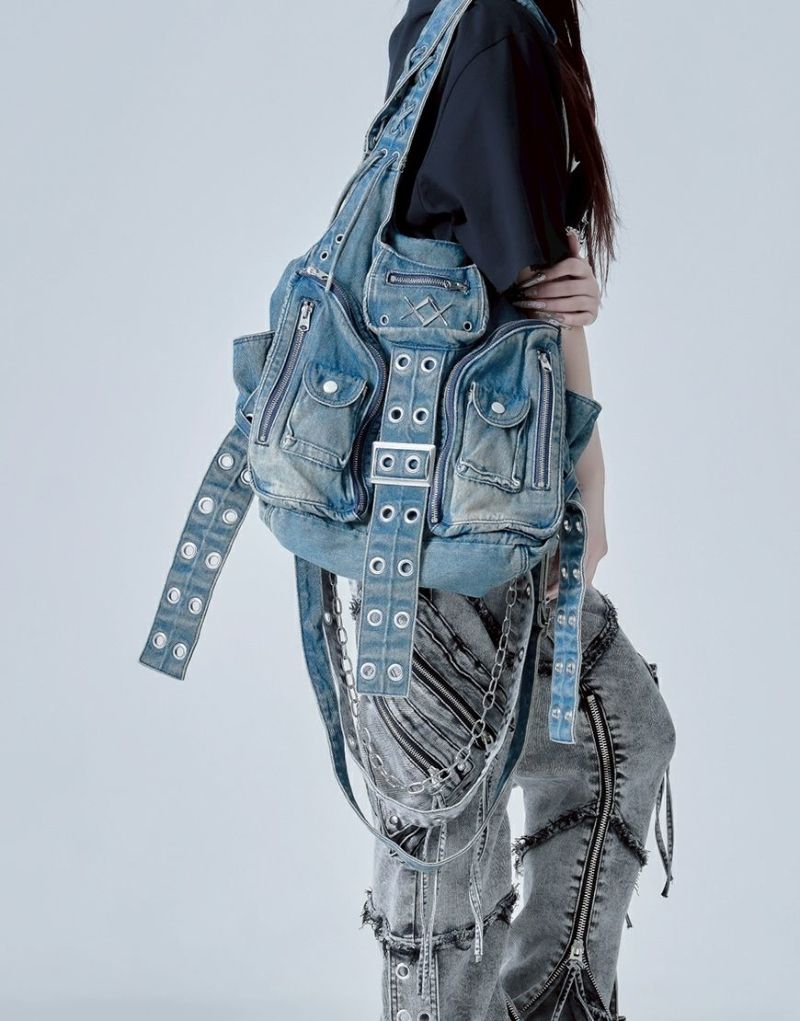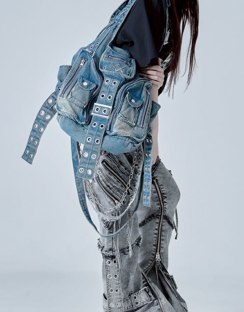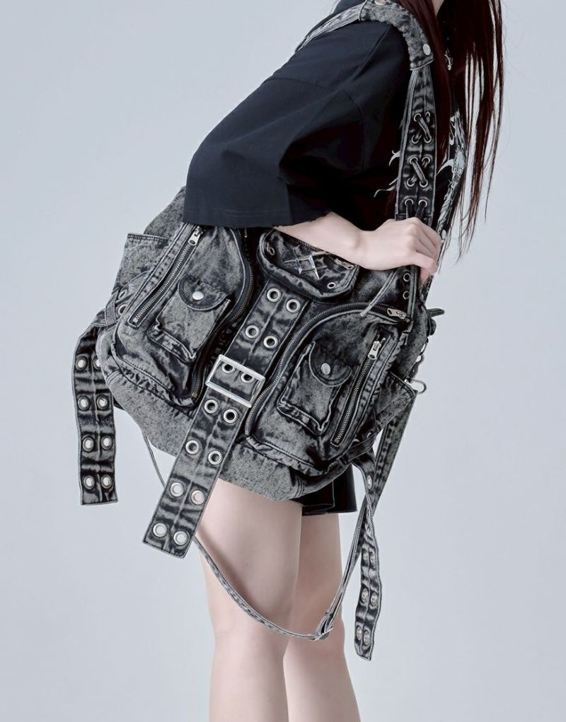 The unique front design, almost like a jacket turned bag, features 10 bold pockets, combining functionality and fashion.