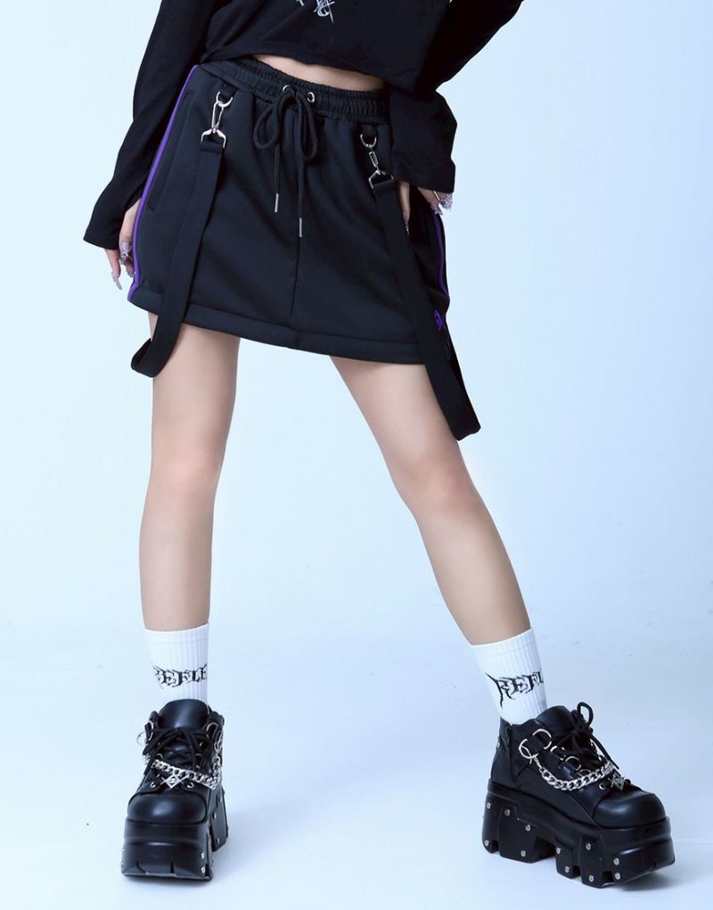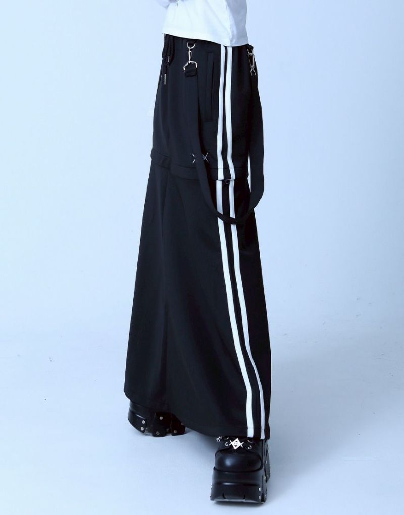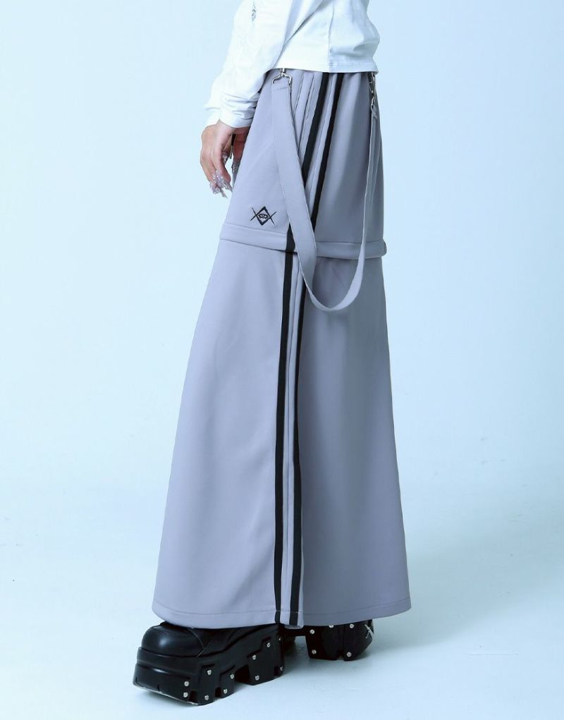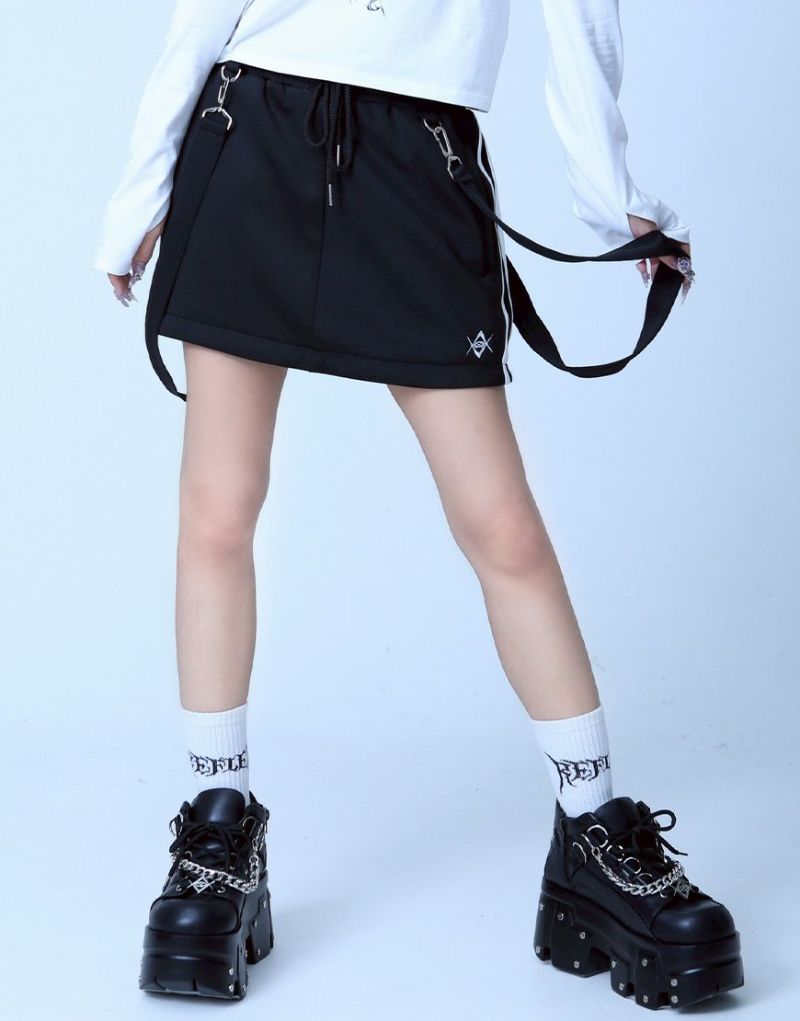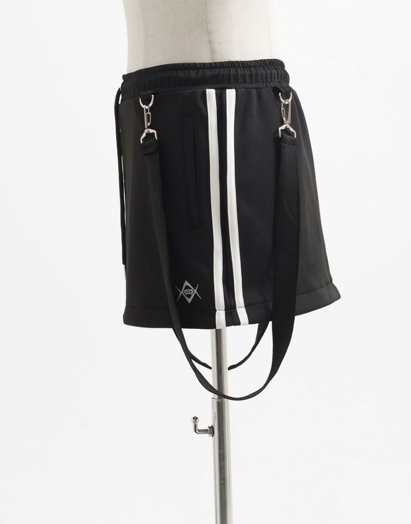 It features matching suspenders for a sporty yet edgy look. The embroidered logo adds a touch of brand presence. The two-way design allows you to customize it to suit your mood and style. We also recommend pairing it with a top from the same series. This unisex piece blends modern and street styles, making it a must-have.
