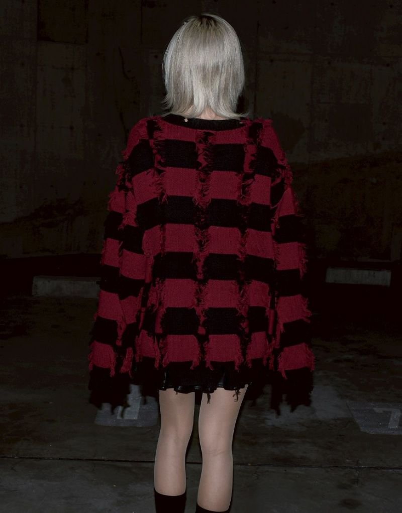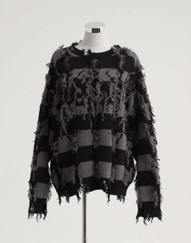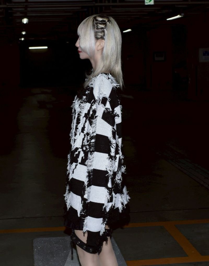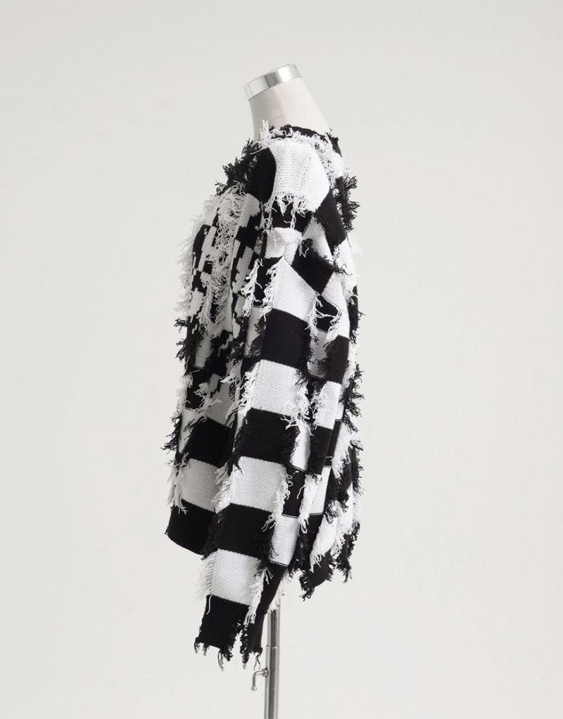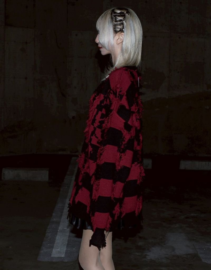 Based on a tubular jacquard knit, the yarn is passed through and then cut to create a unique fuzziness and three-dimensional texture. Partially frayed fringe processing creates an artistic, distressed look.