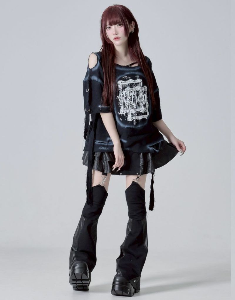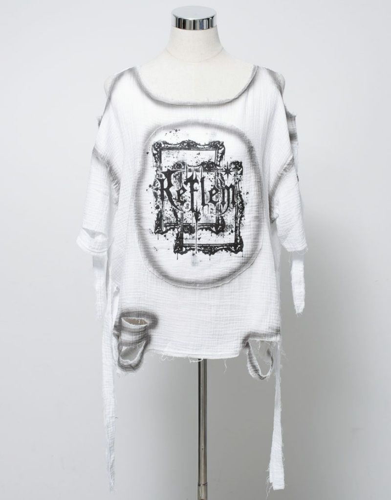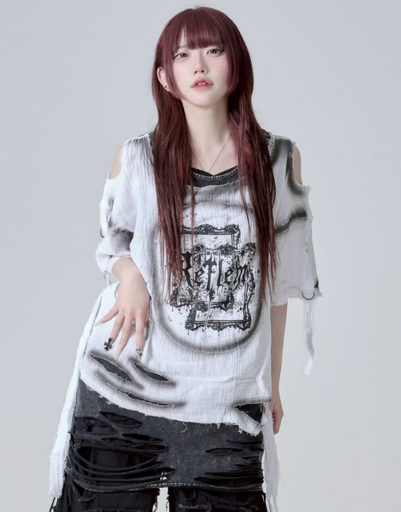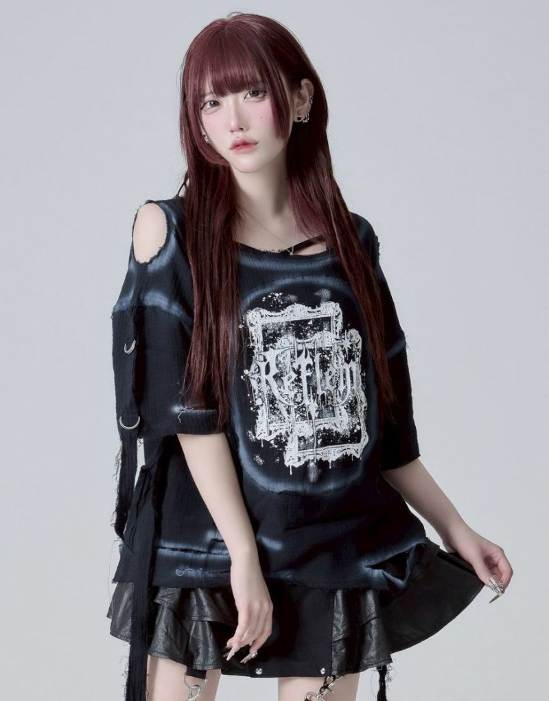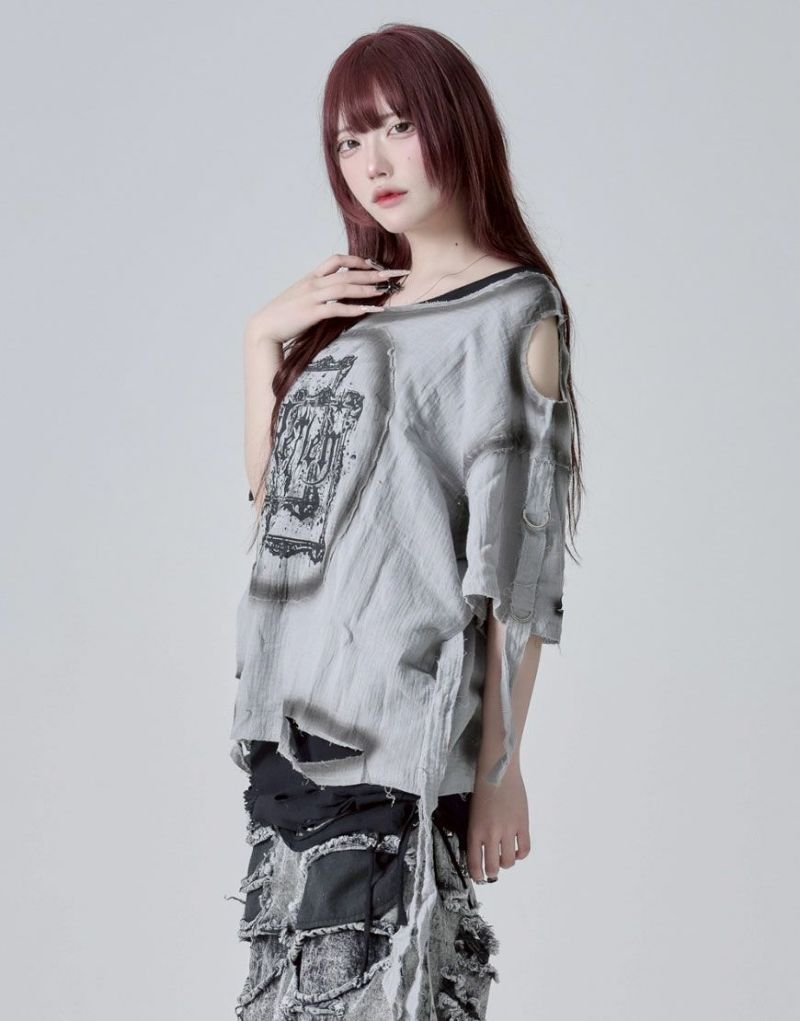 The graphic is printed, while the body features partial distressing and spray treatments for a grunge feel. Suitable for both men and women.