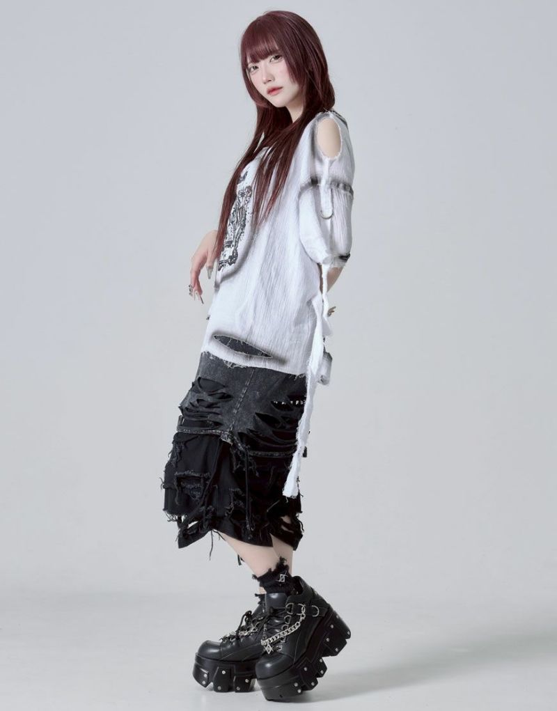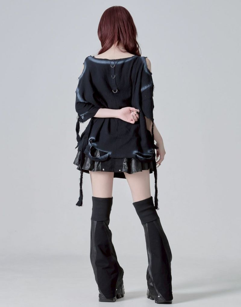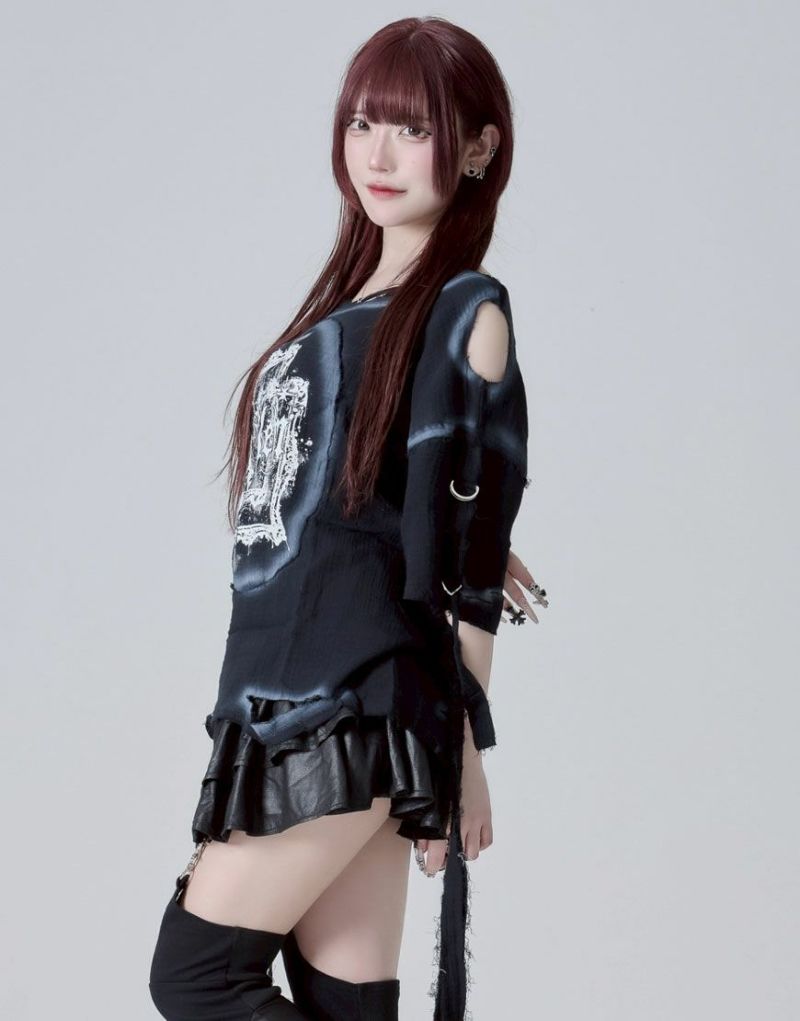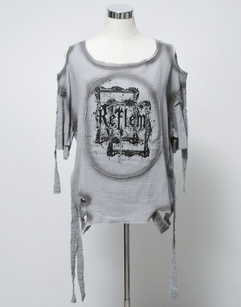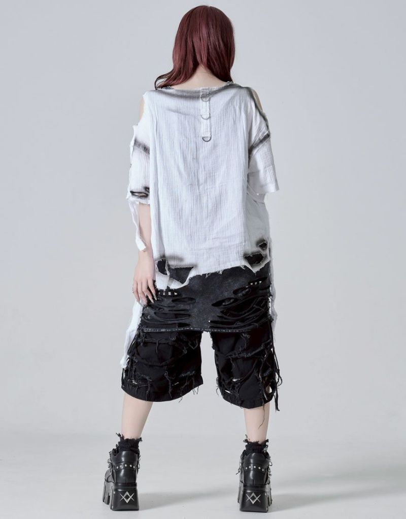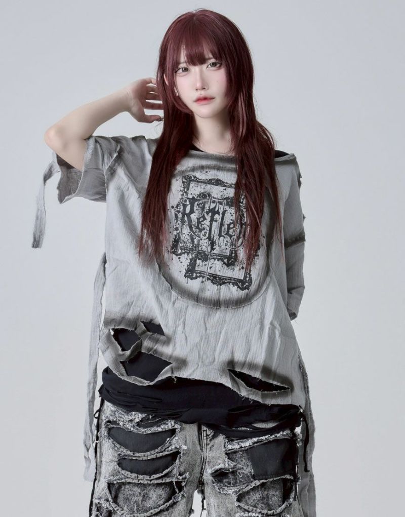 The graphic is printed, while the body features partial distressing and spray treatments for a grunge feel. Suitable for both men and women.