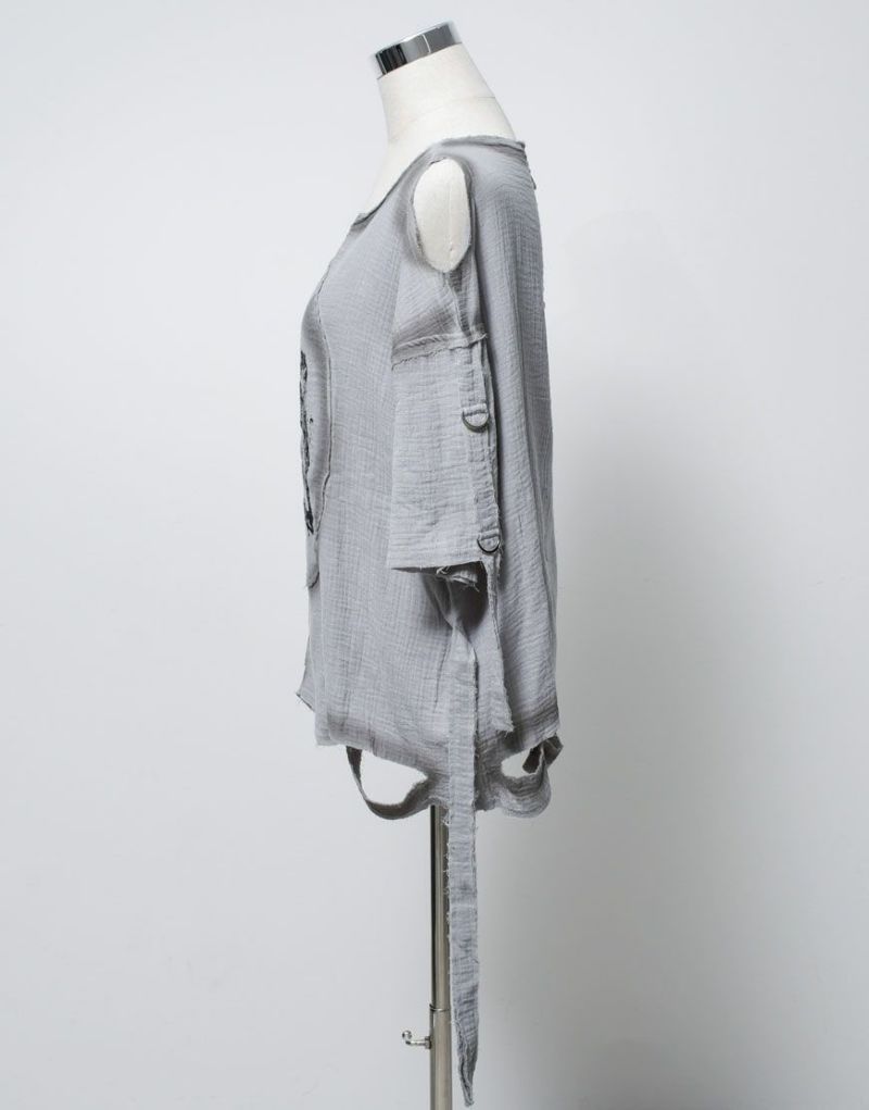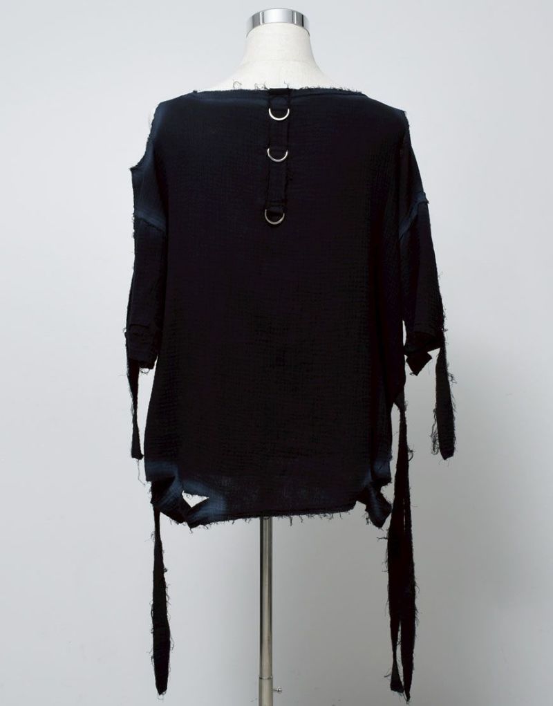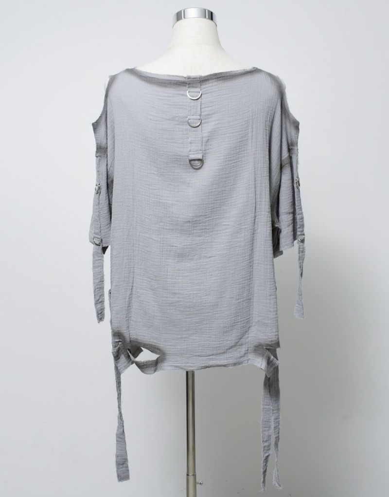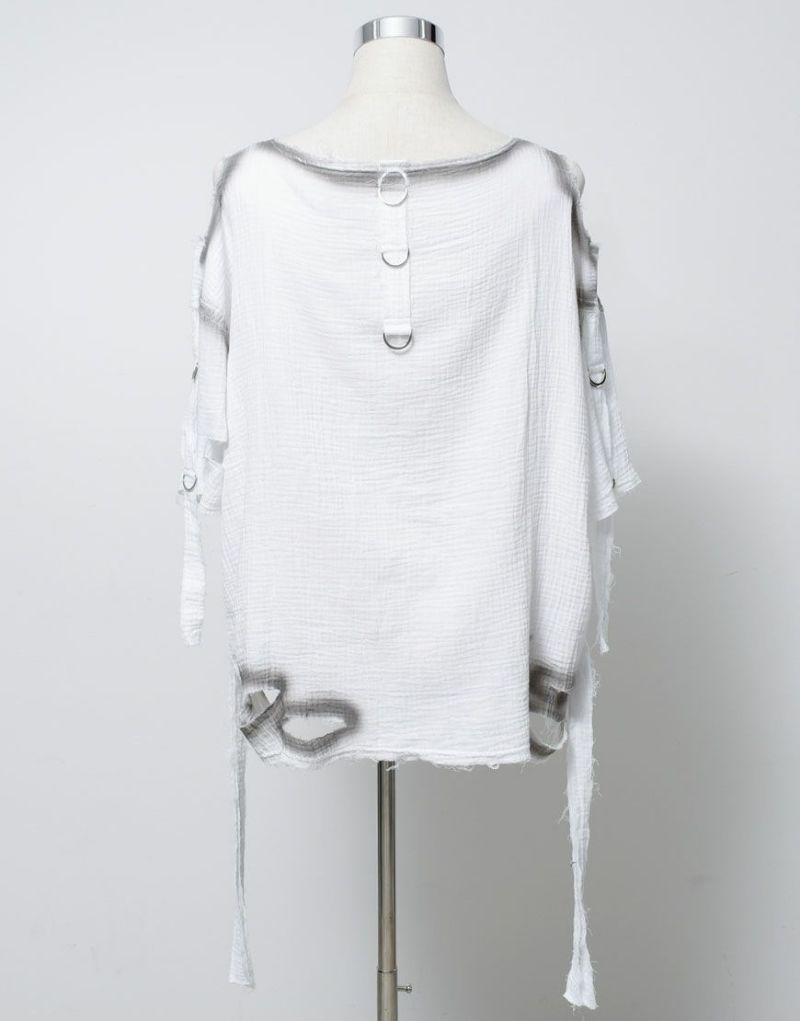 Crafted from double gauze fabric, this top features a signature design. It features dangling ties on both sides and a D-ring at the back.