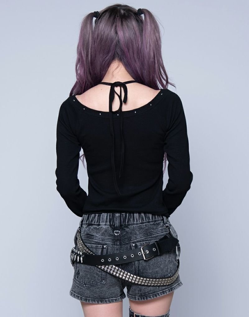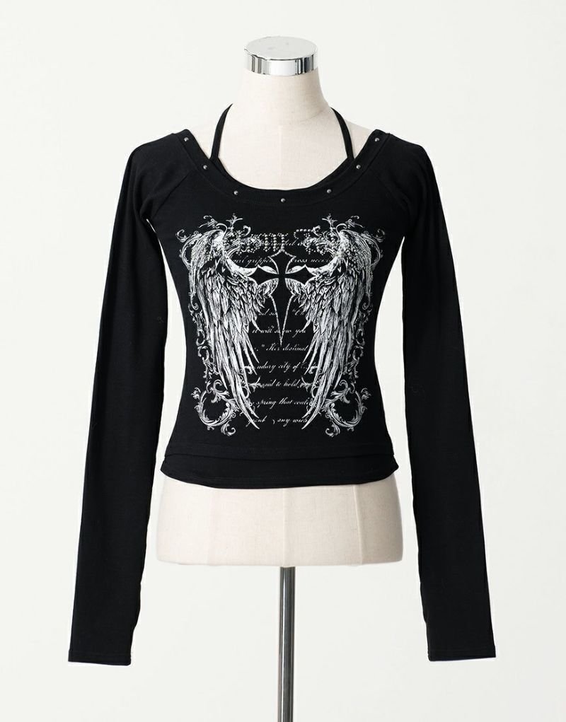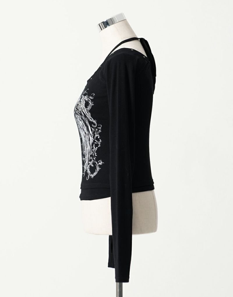 The front features a delicate yet bold graphic print, making it a statement piece. Dome-shaped rivets in a black and silver color scheme on the collar rib add an edgy accent. The two-way design allows it to be worn off the shoulders, allowing you to customize it to suit your style and mood.