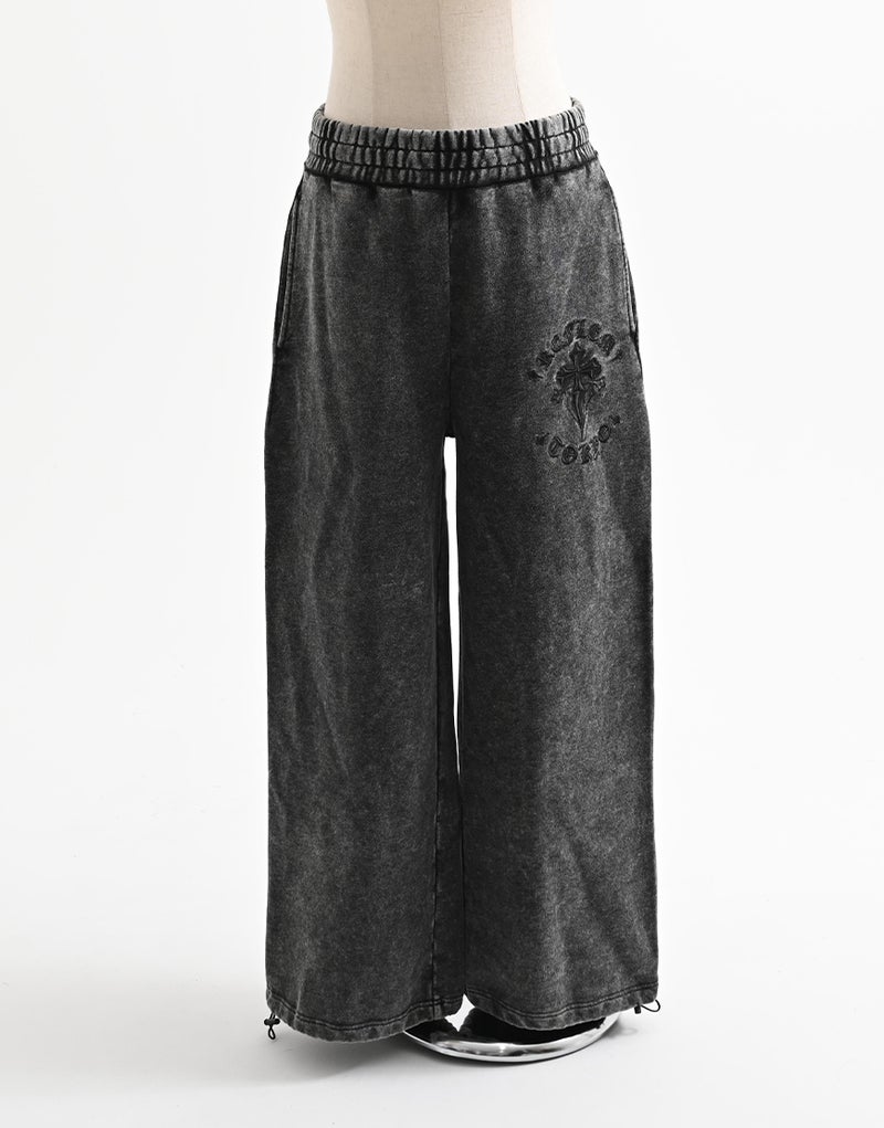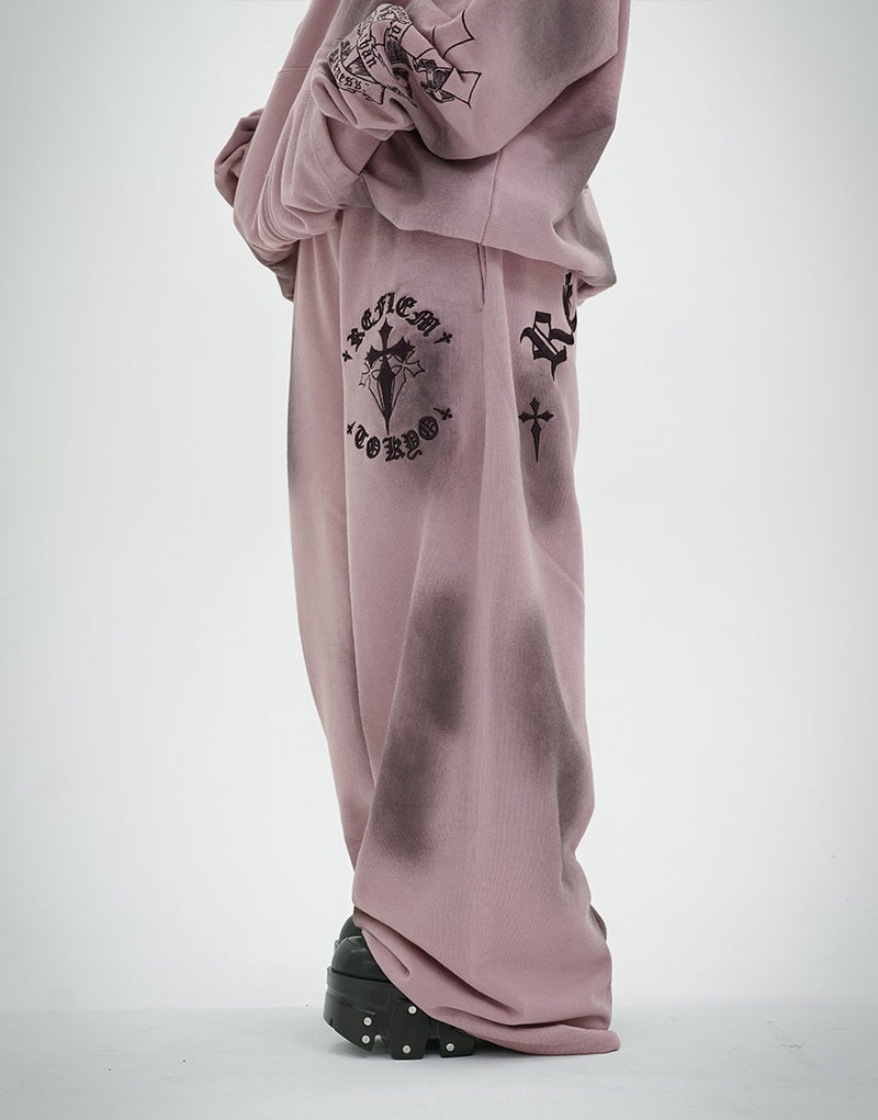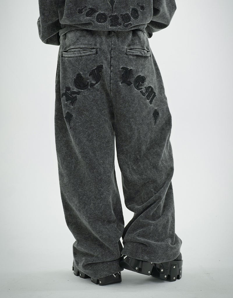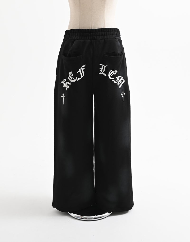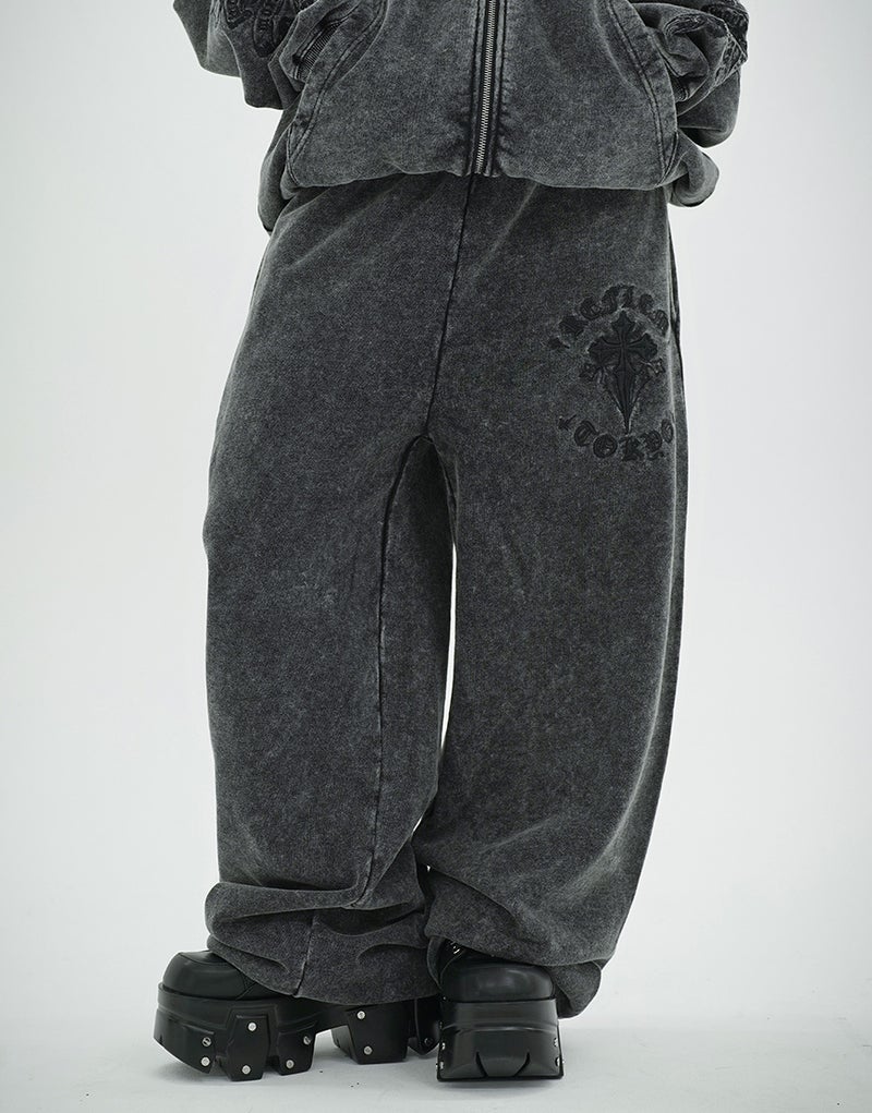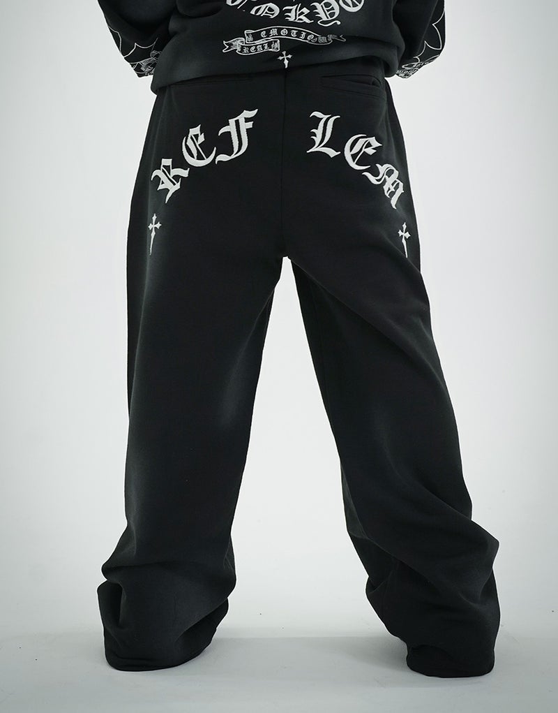 Crafted from 450g fleece, these heavyweight sweatpants create a luxurious feel. They feature embroidered Gothic artwork and a wide silhouette. Elastic waist and hem adjusters ensure exceptional comfort.