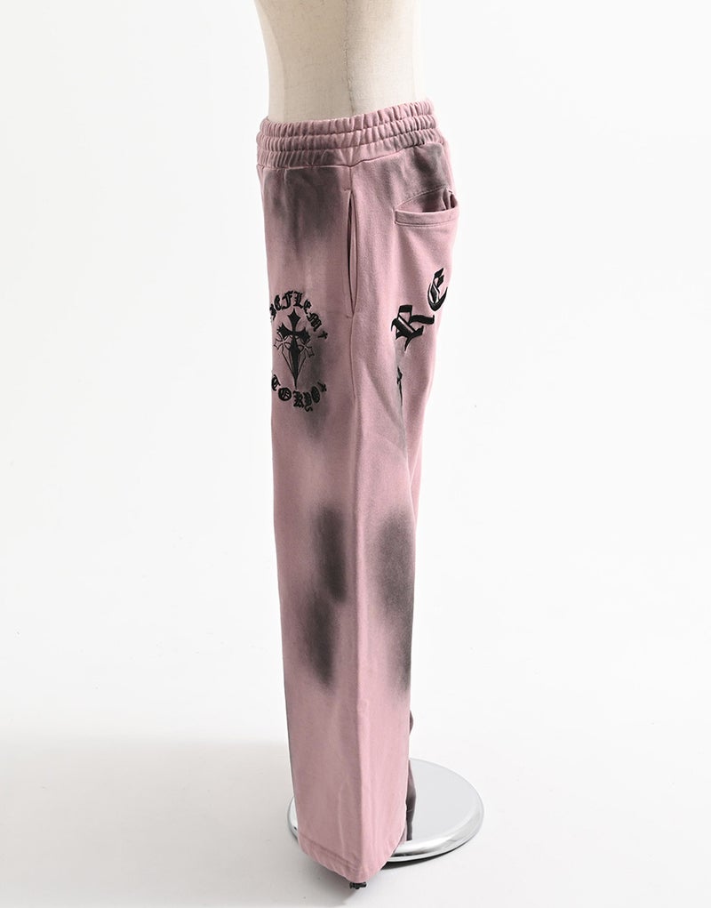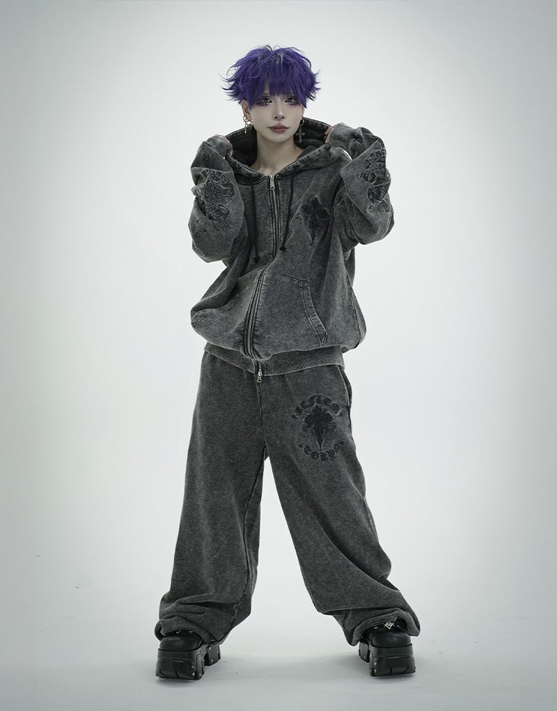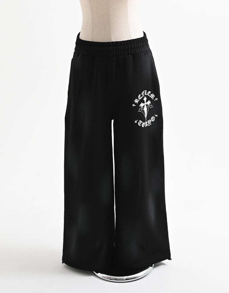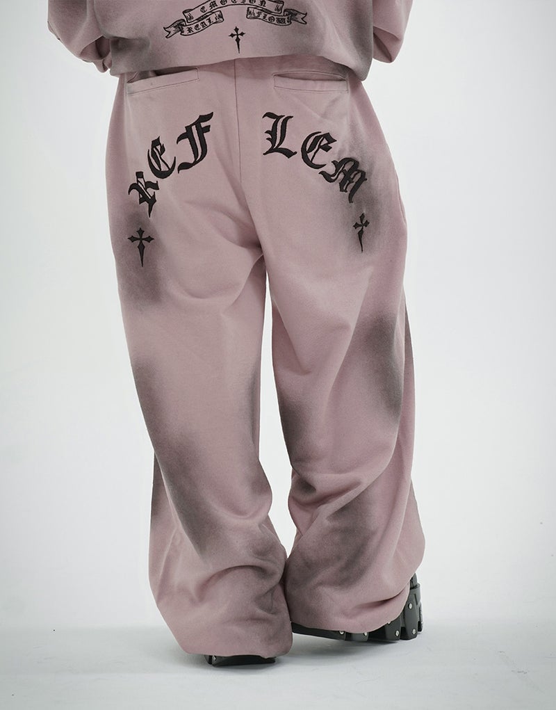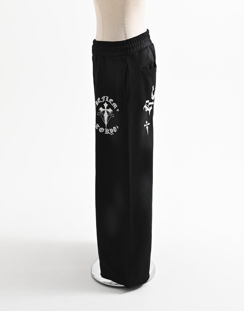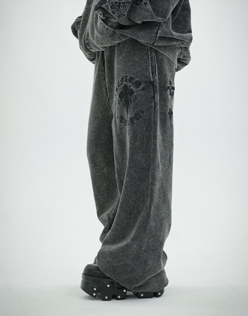 Crafted from 450g fleece, these heavyweight sweatpants create a luxurious feel. They feature embroidered Gothic artwork and a wide silhouette. Elastic waist and hem adjusters ensure exceptional comfort.