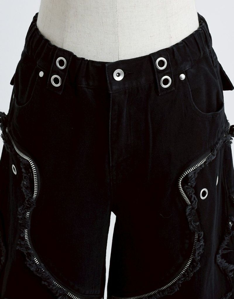 Made with the same denim fabric, these wide-leg pants feature rivets on both sides and zipper loops for a three-dimensional effect. Crafted from 100% cotton denim, they feature cargo pockets at the front hem.