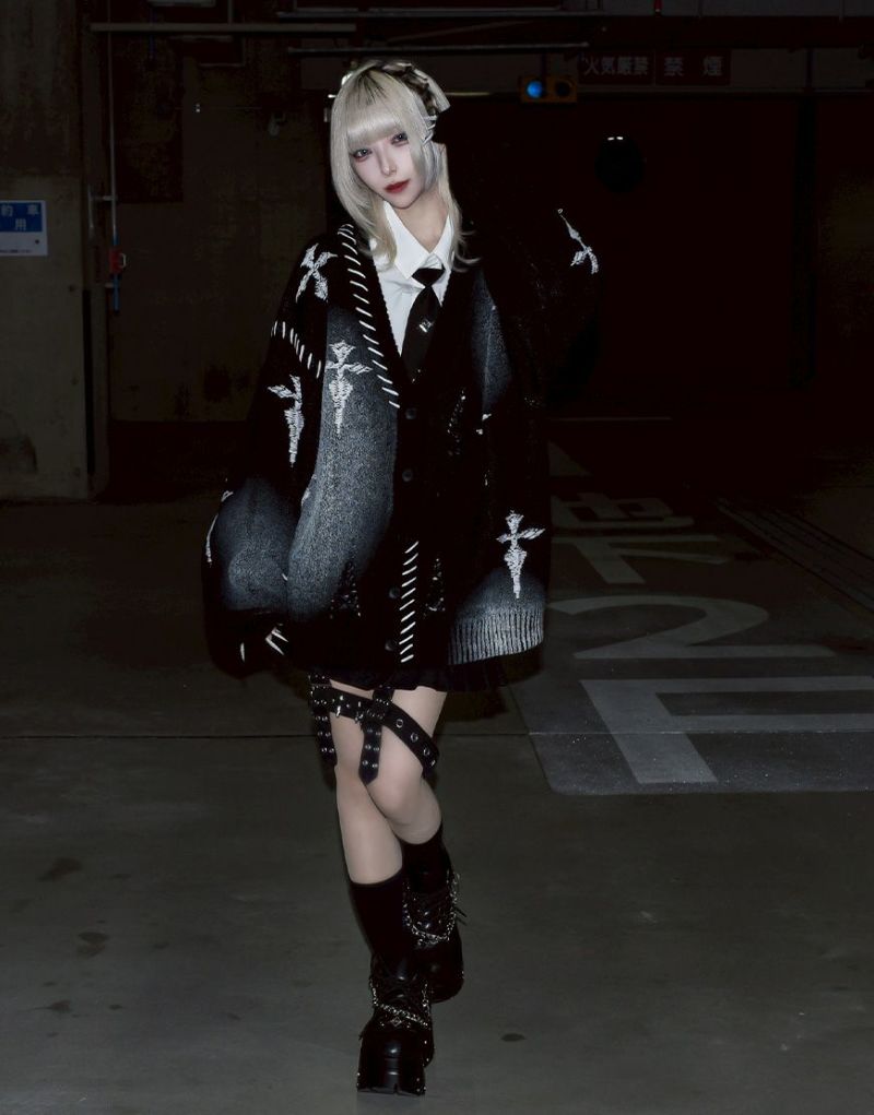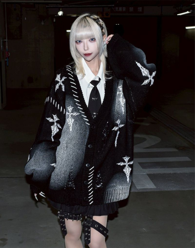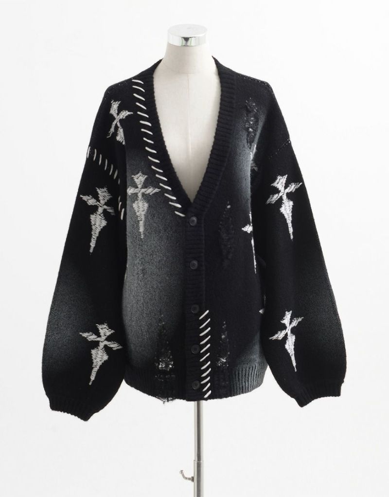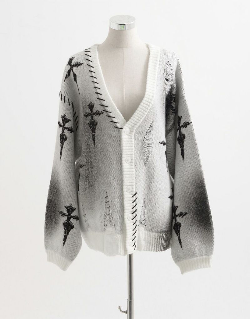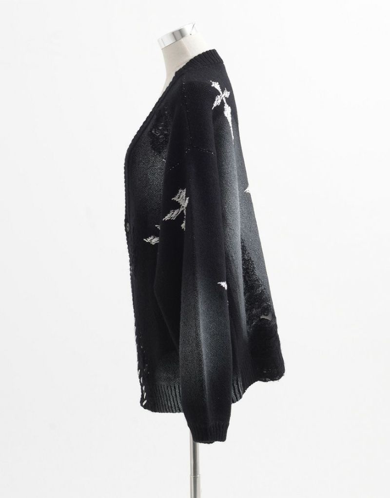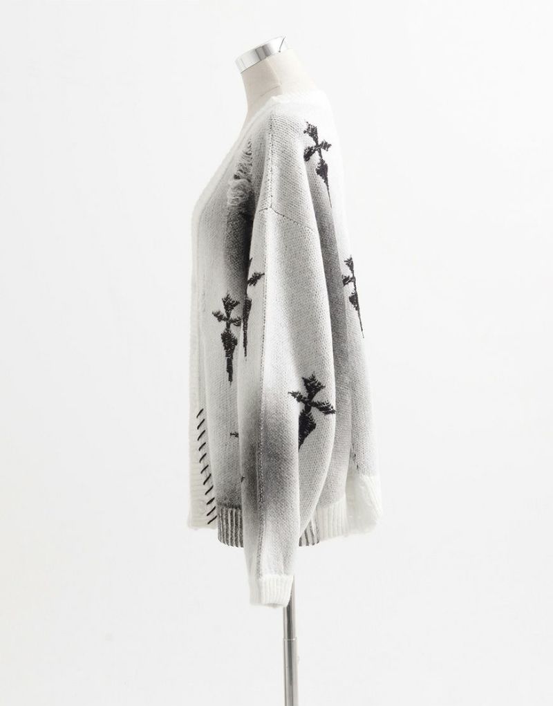 Heavy KnitREFLEM presents this crushed cross cardigan with a spray-on rubber print.