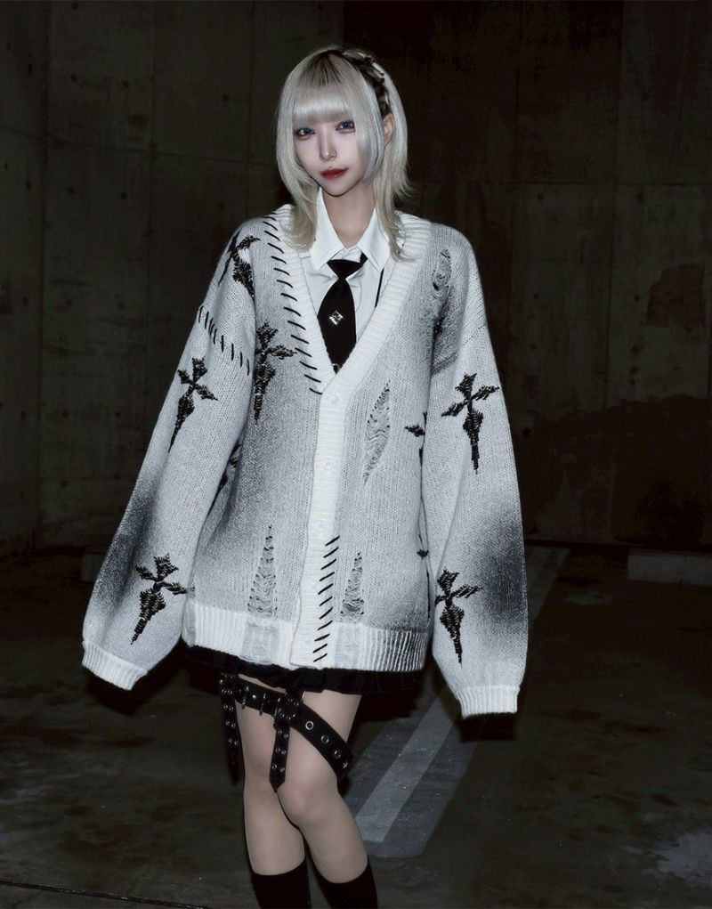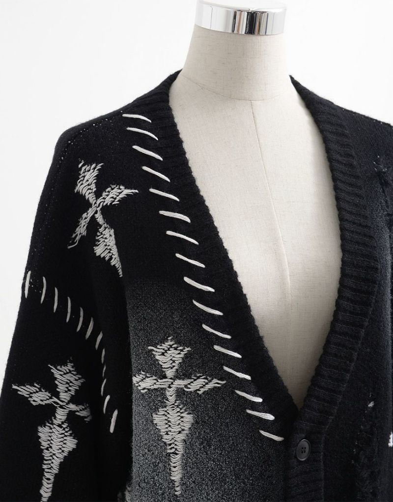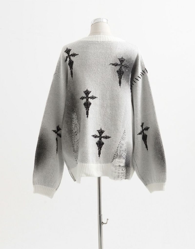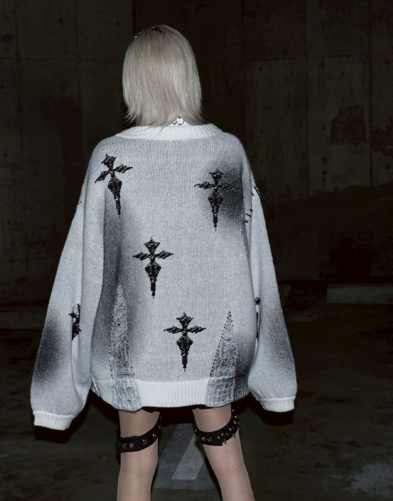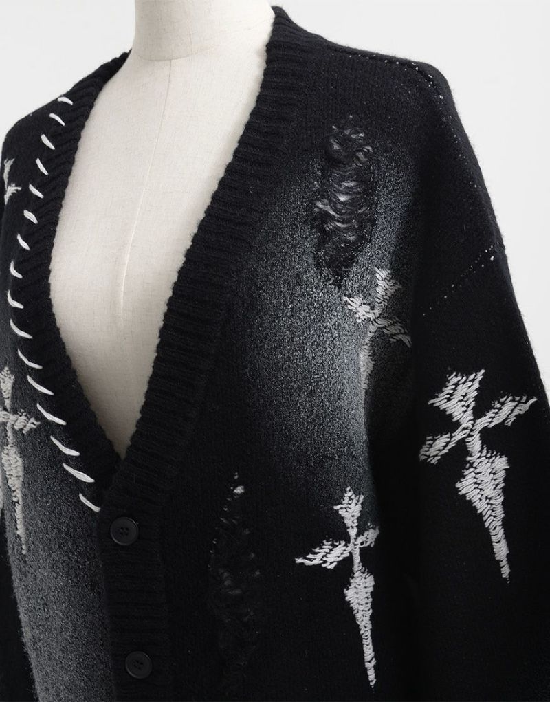 The crosses scattered throughout create a striking look, while the distressed finish adds a decadent touch. The loose silhouette and deep V-neck create a modern yet languid impression.