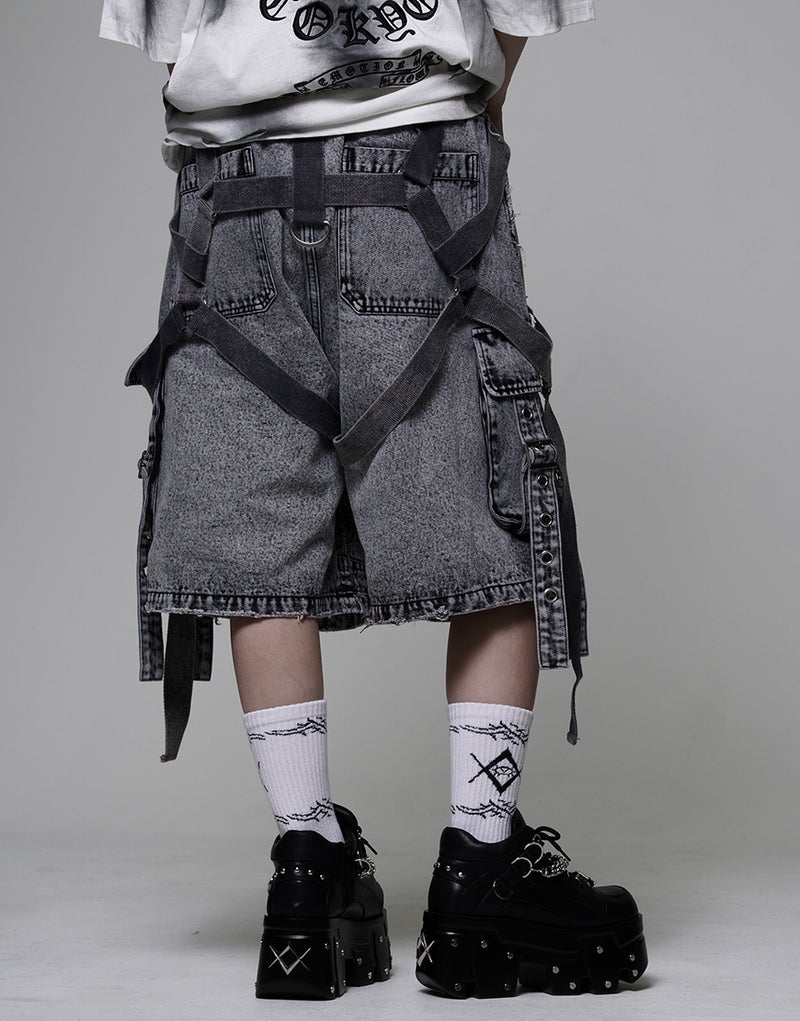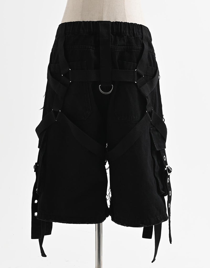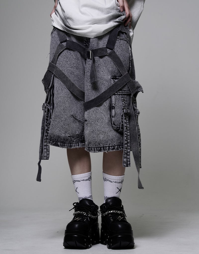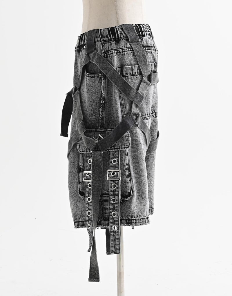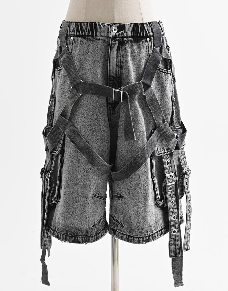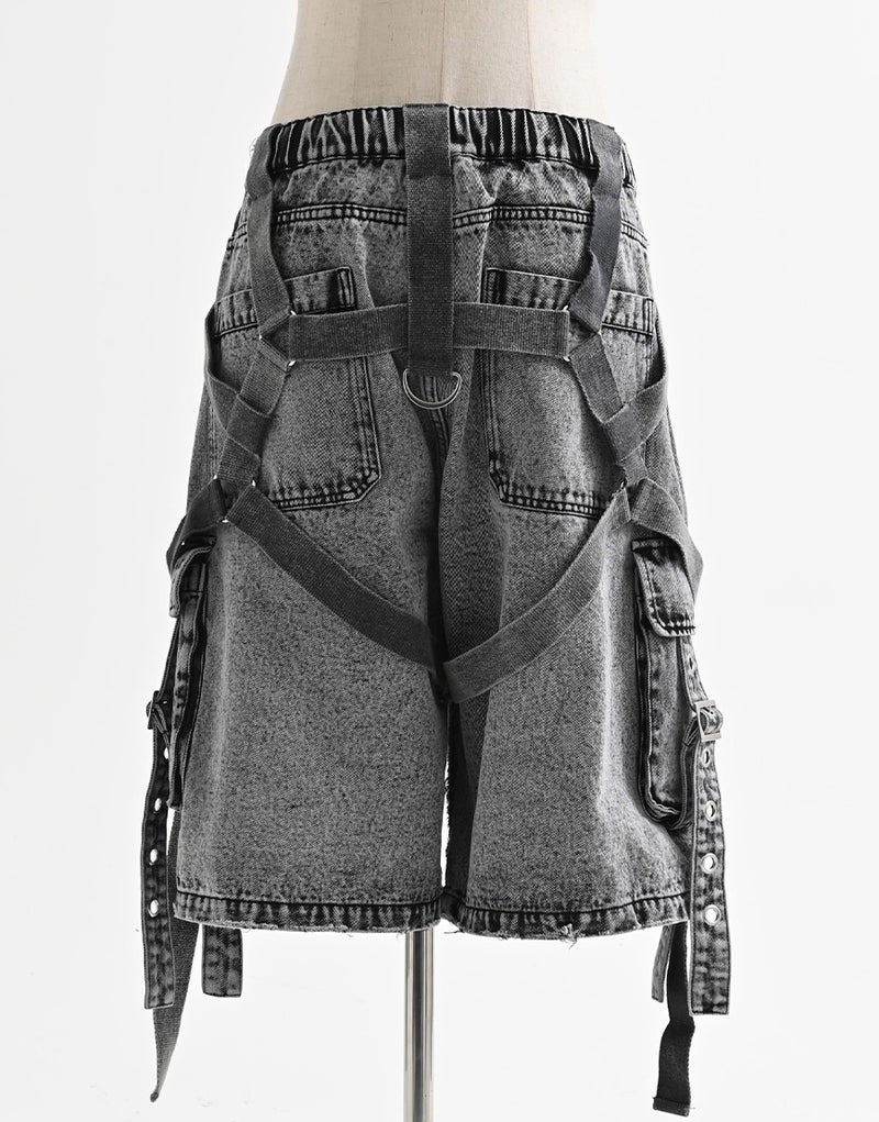 These cargo shorts combine rugged denim with harness details for a bold statement look. Crafted from 100% cotton denim, the sturdy fabric and realistic finish create a dignified impression.