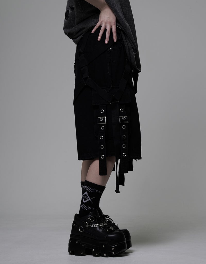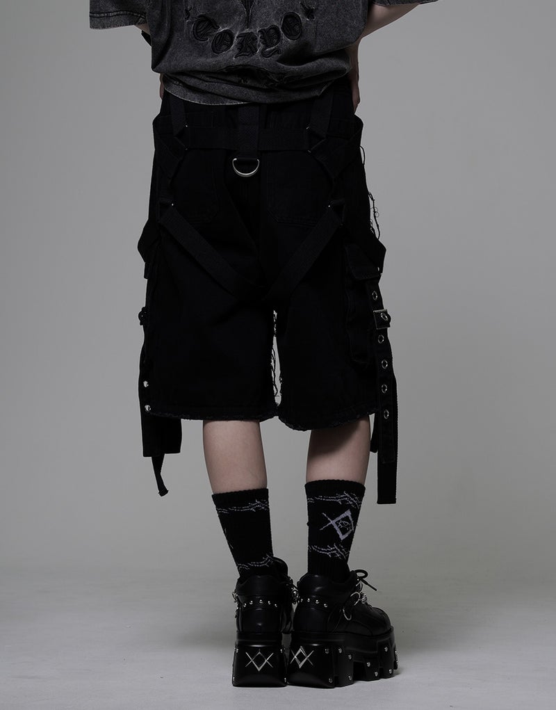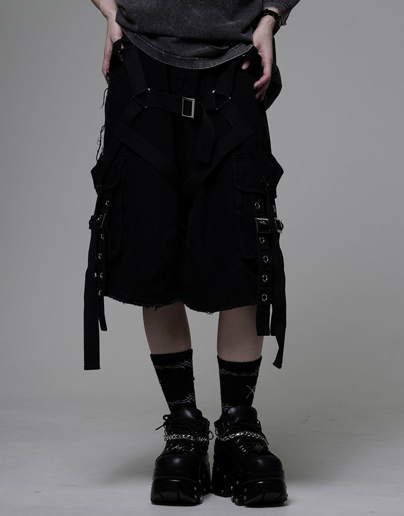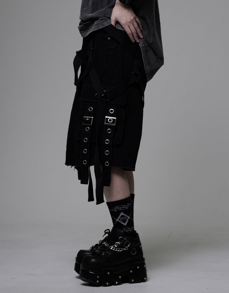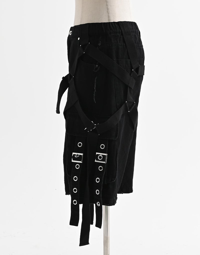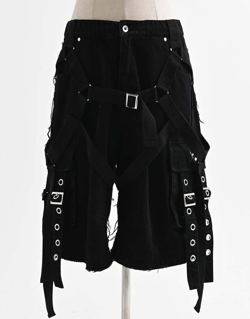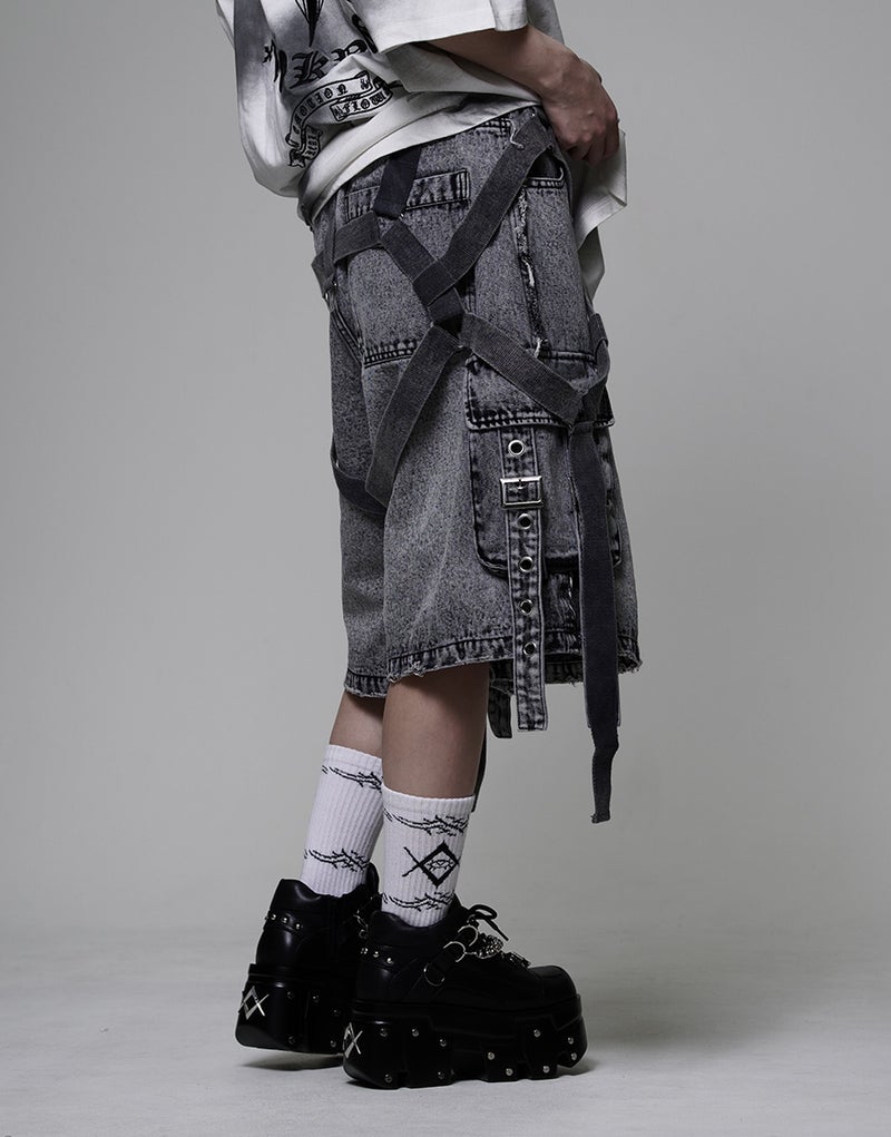 These cargo shorts combine rugged denim with harness details for a bold statement look. Crafted from 100% cotton denim, the sturdy fabric and realistic finish create a dignified impression.