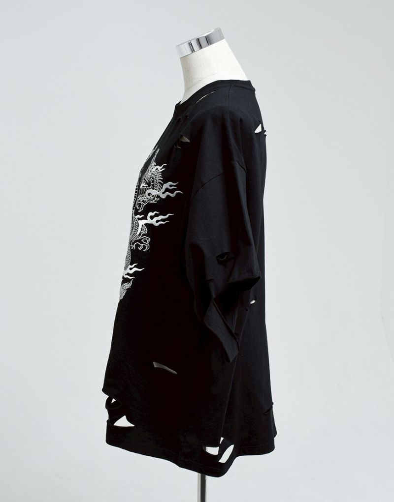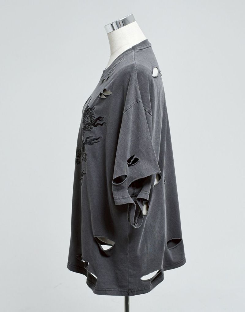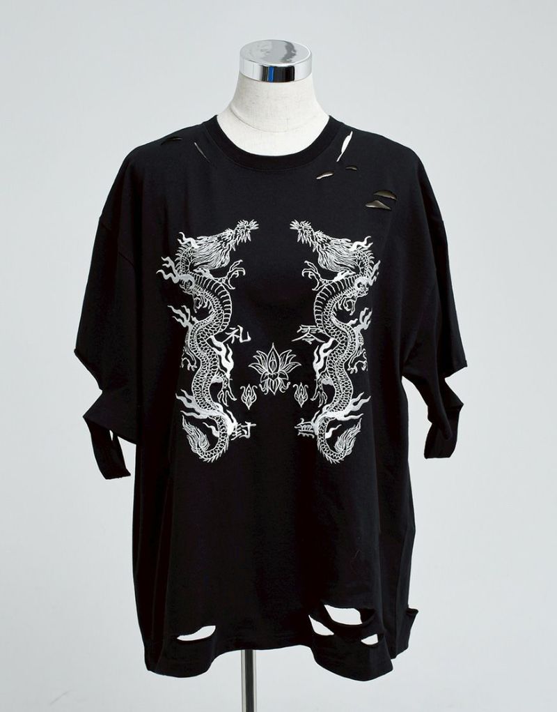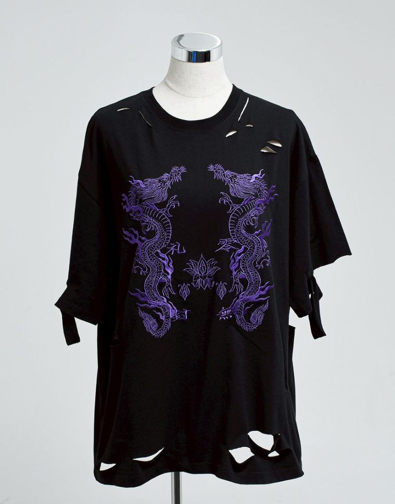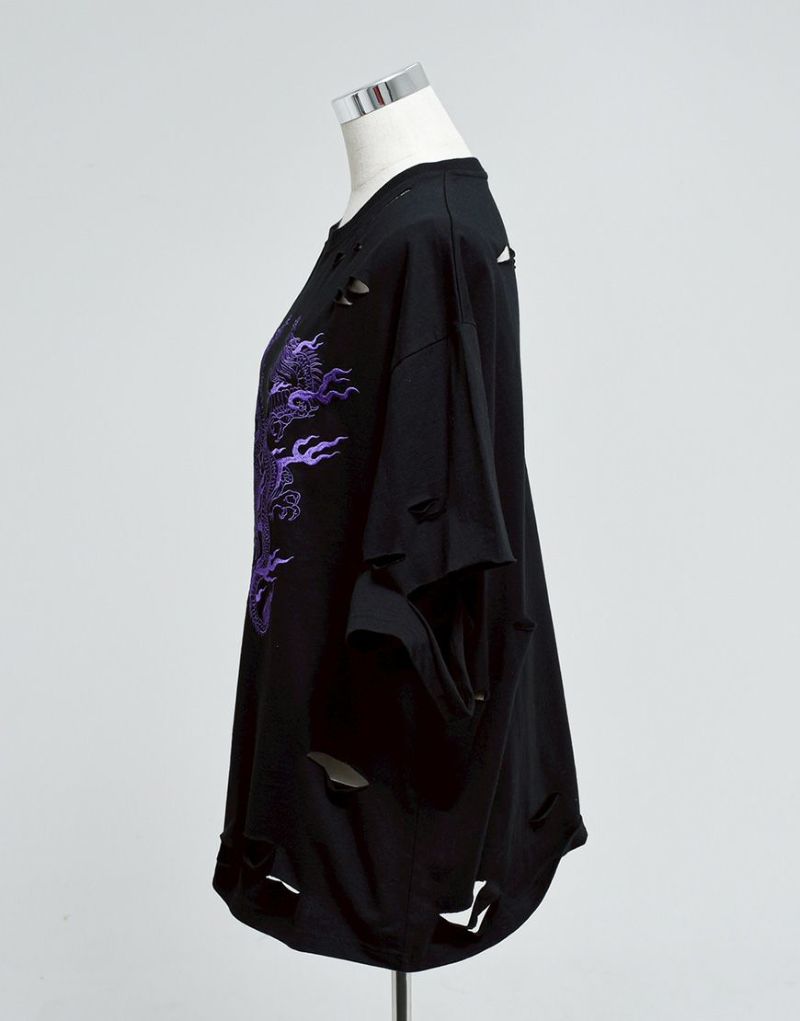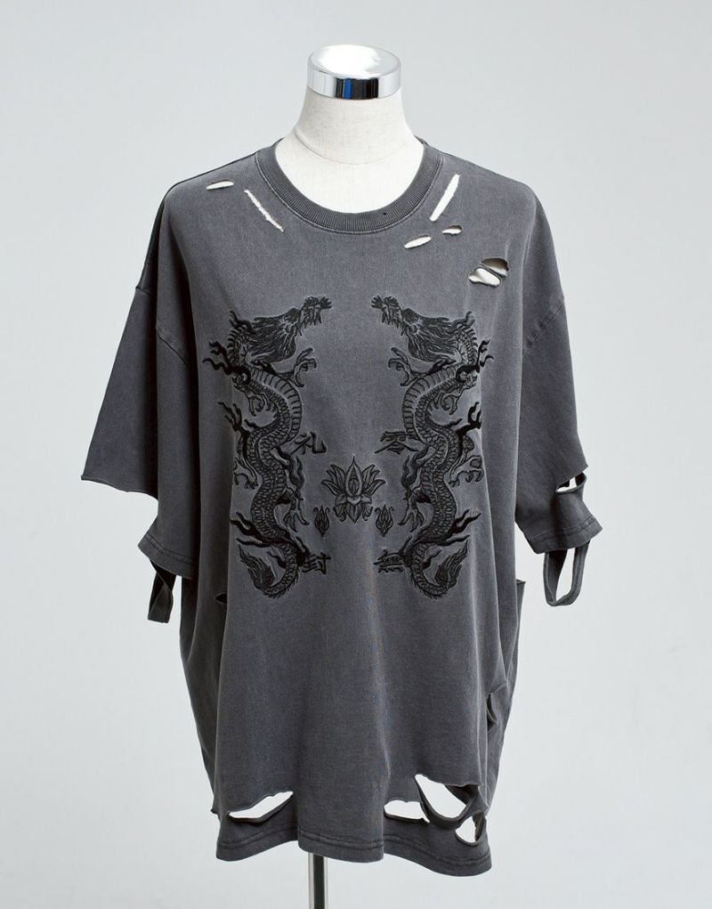 This oversized T-shirt features various large and small damages. It features an oriental-inspired dragon artwork embroidered on the back.