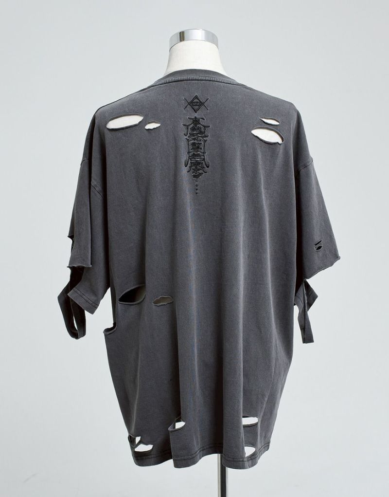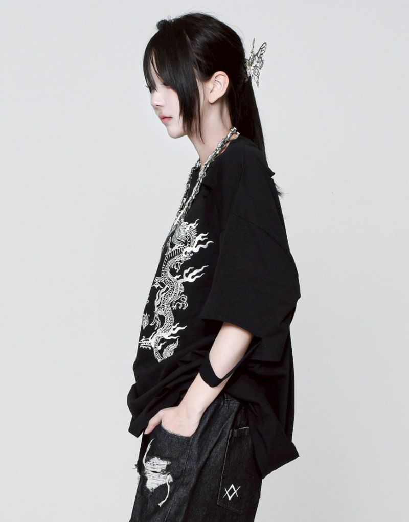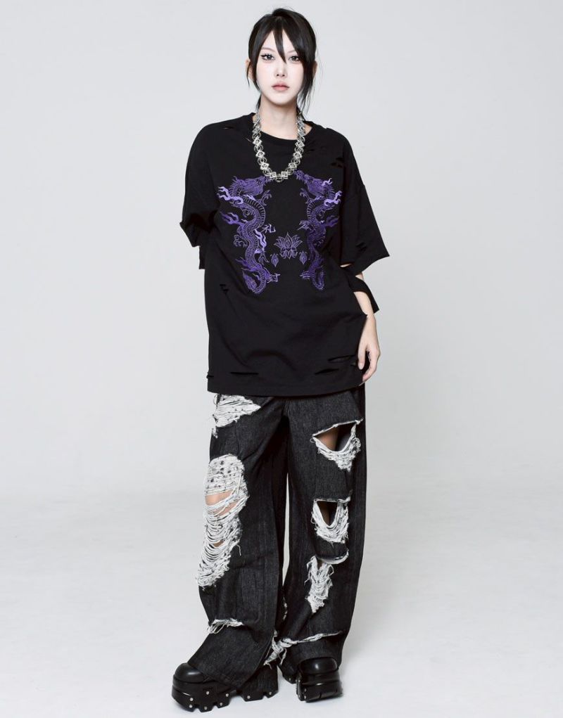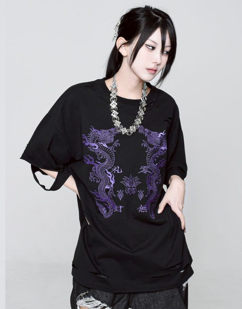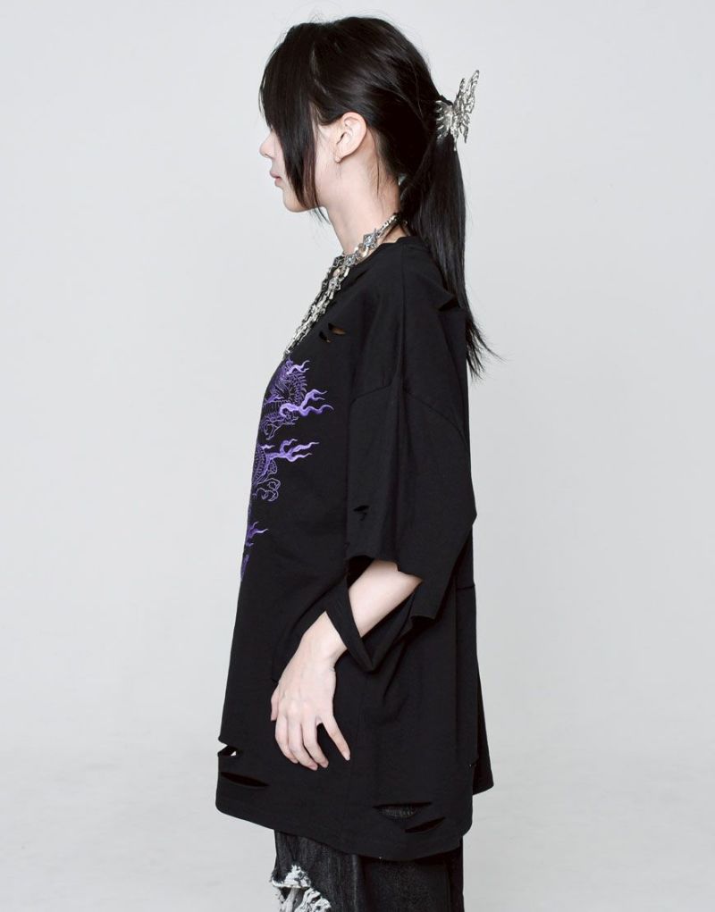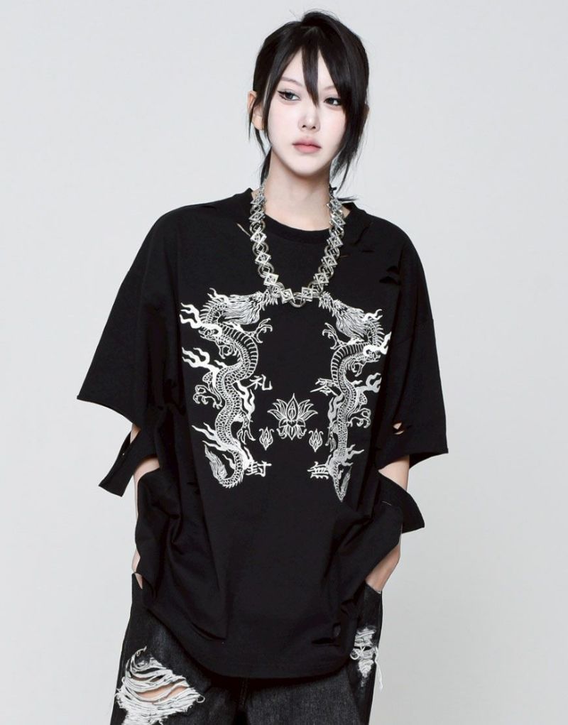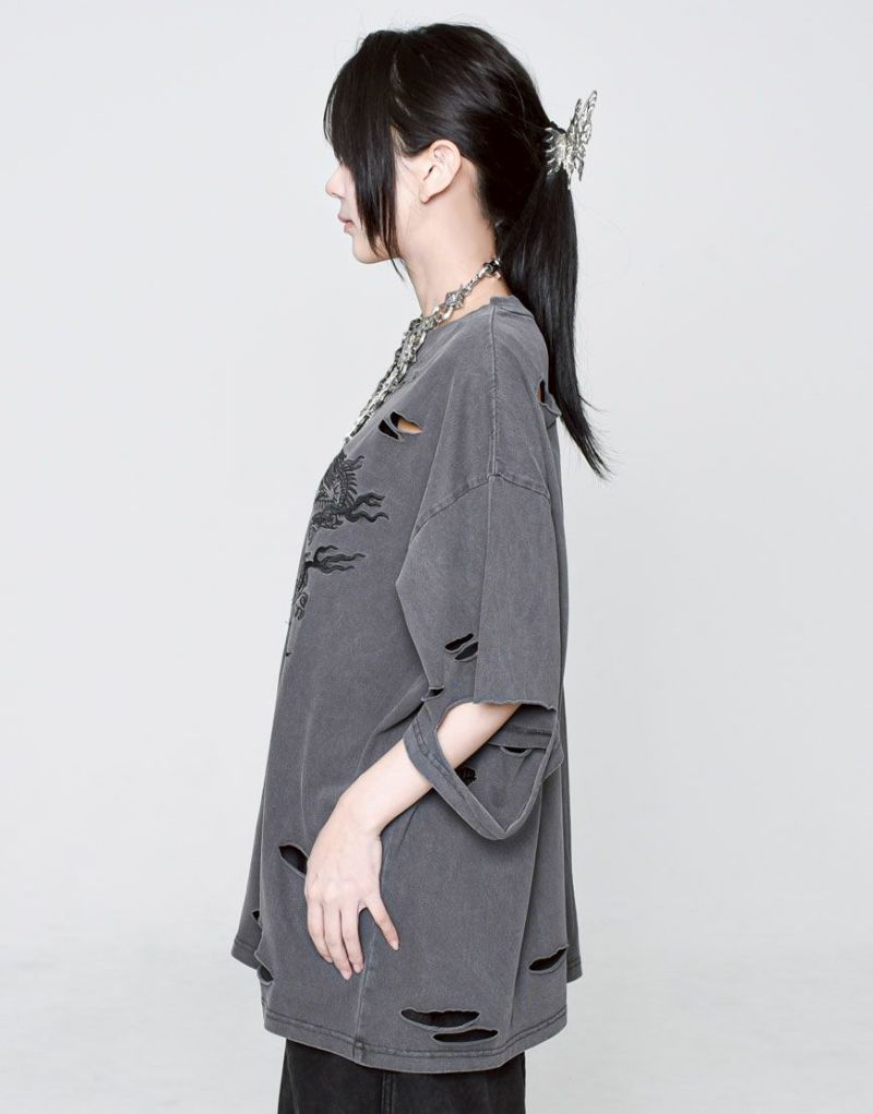This oversized T-shirt features various large and small damages. It features an oriental-inspired dragon artwork embroidered on the back.