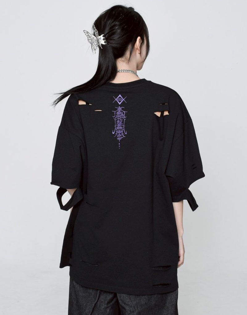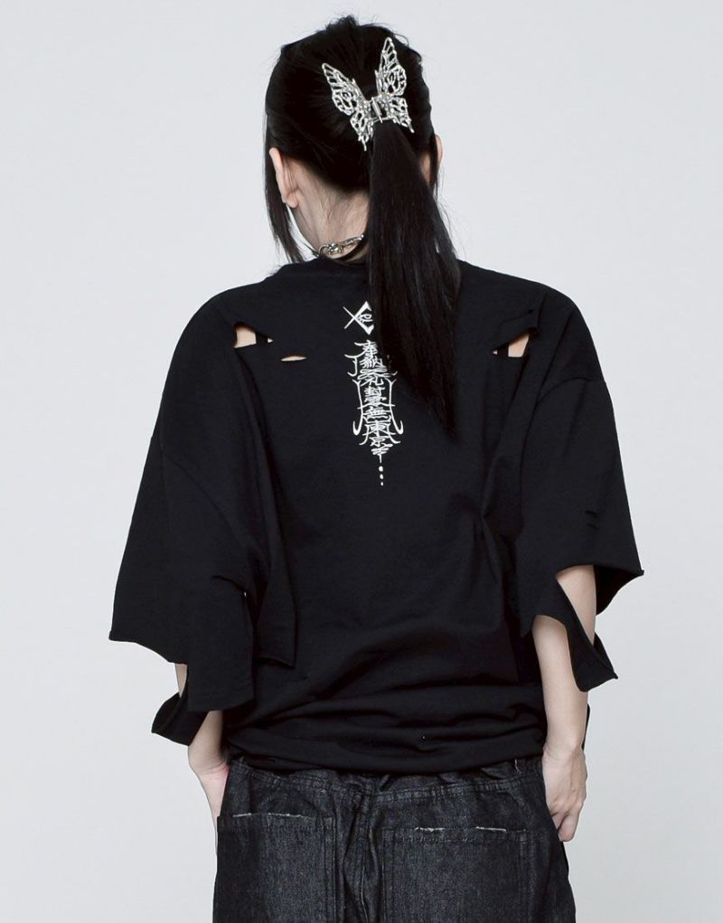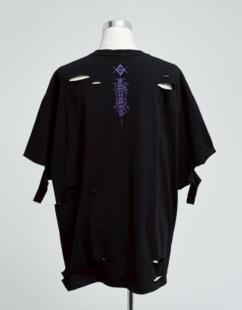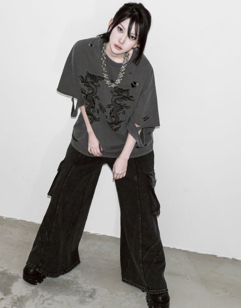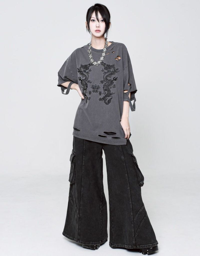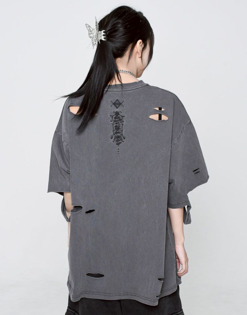 This oversized T-shirt features various large and small damages. It features an oriental-inspired dragon artwork embroidered on the back.