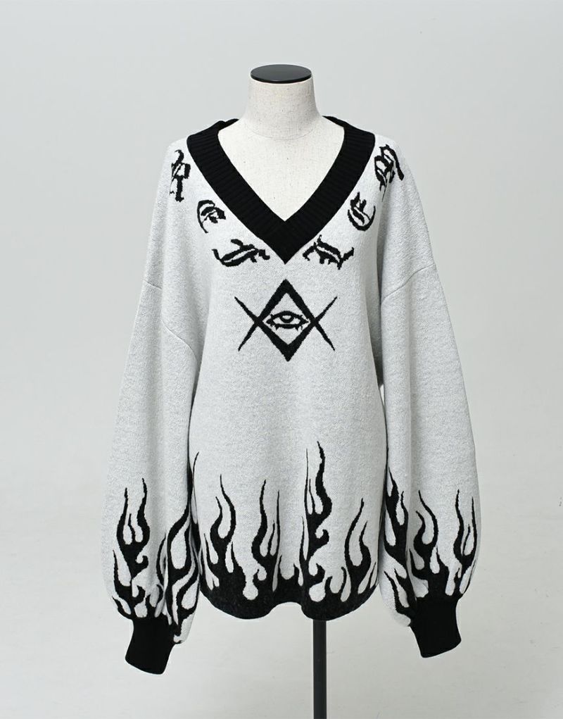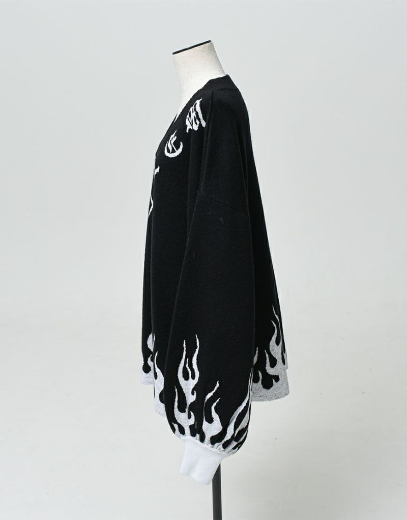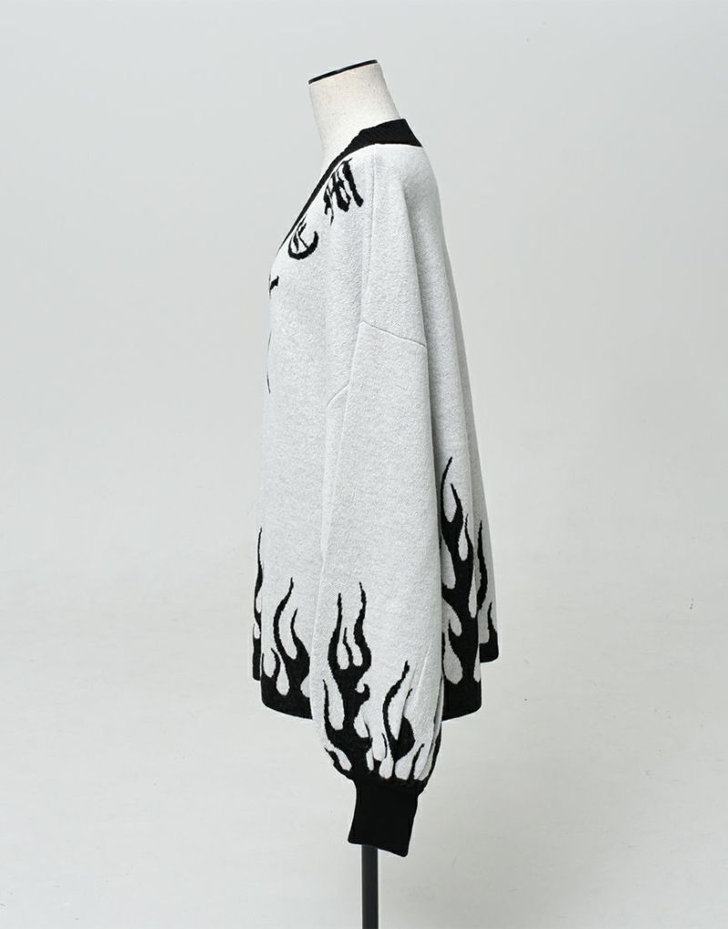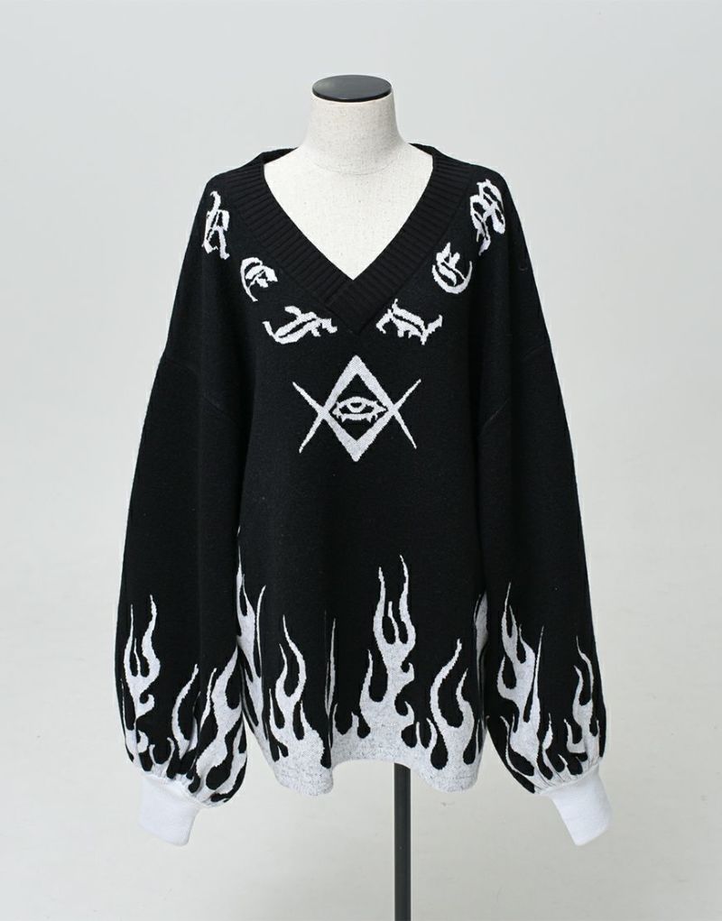 This pullover knit has a logo and motif to follow the V-neck, and a fire pattern on the hem and cuffs.