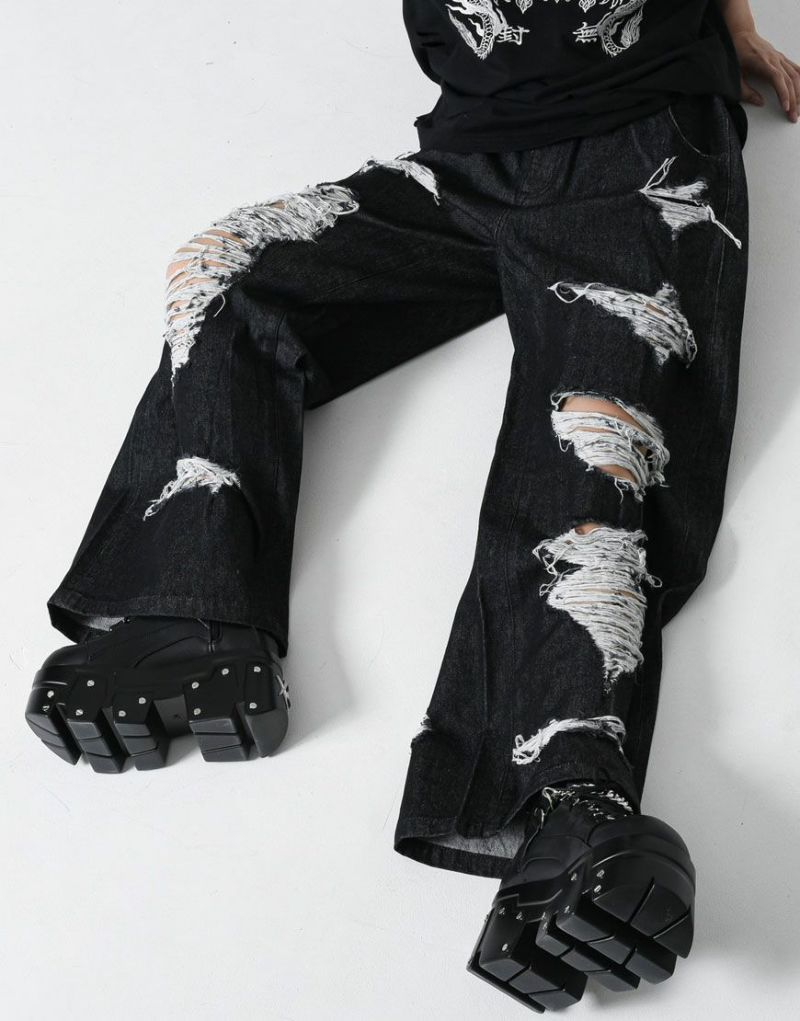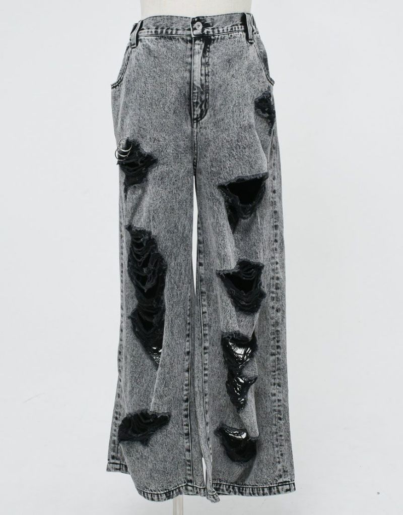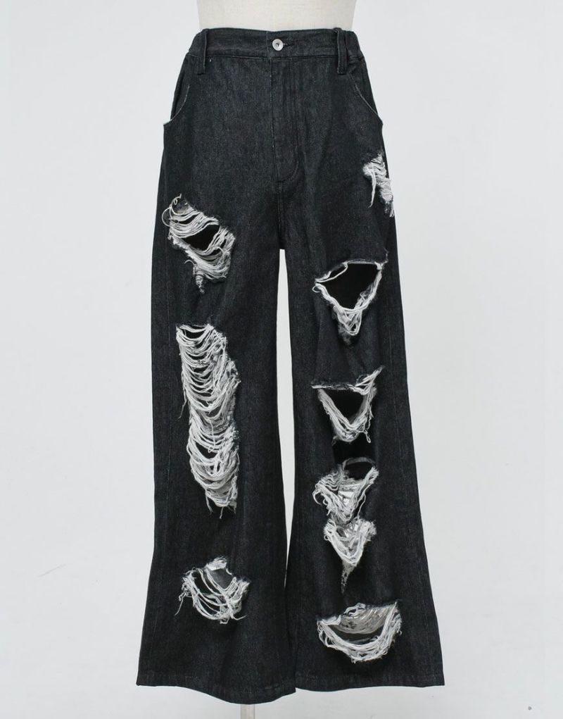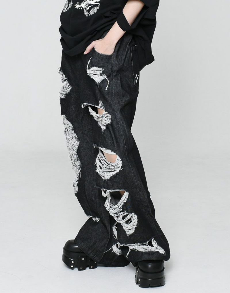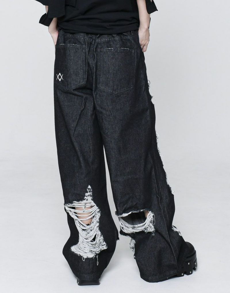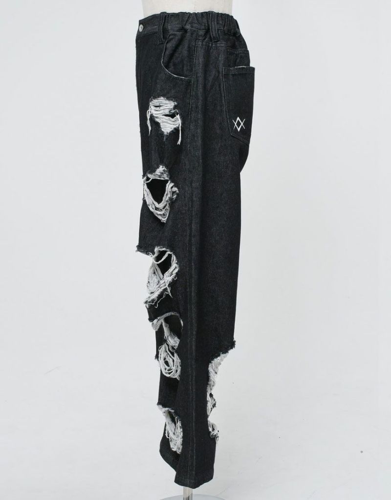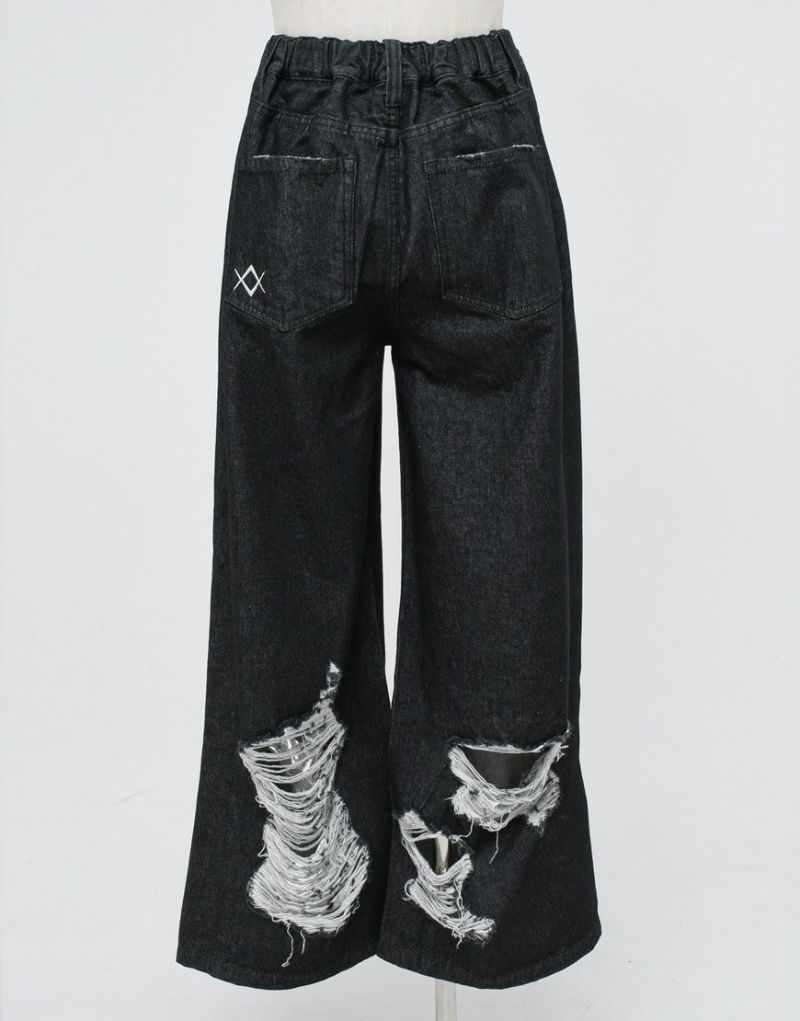 Crafted from 100% cotton black denim, these wide-leg denim pants feature extensive distressed detailing. The distressed detailing on the front features a triple ring, and the logo is embroidered on the left back pocket.