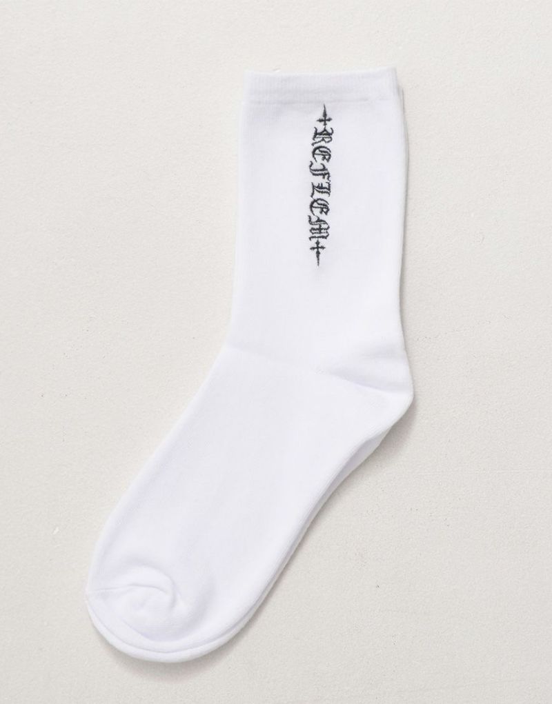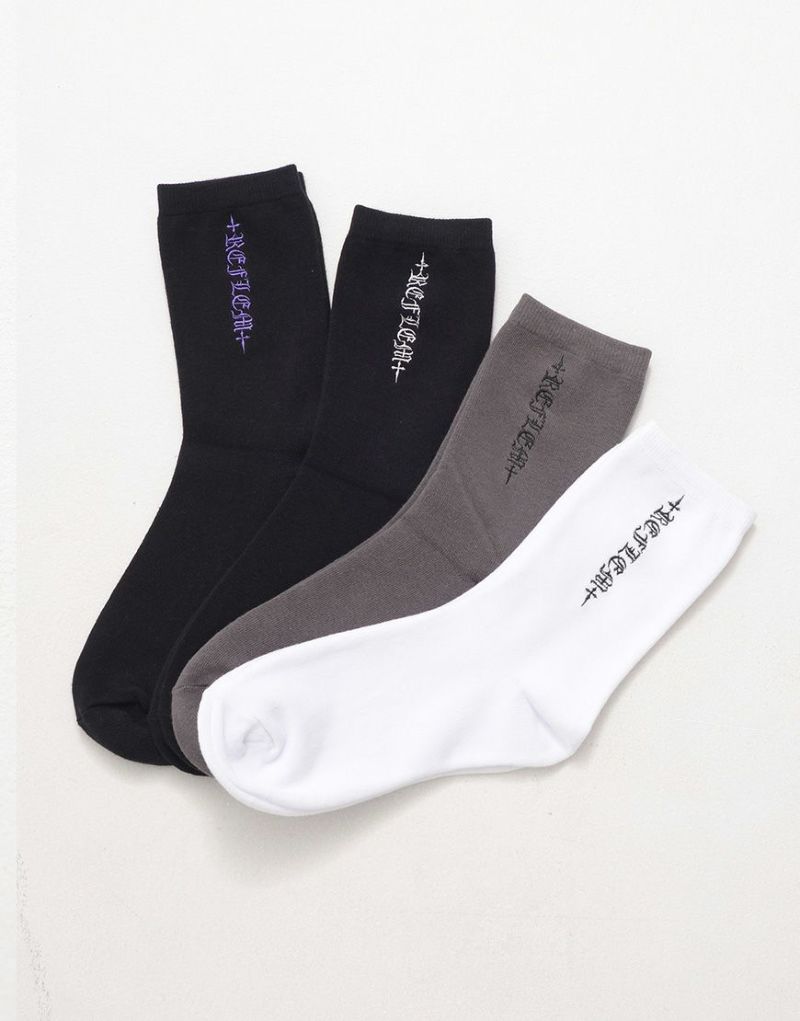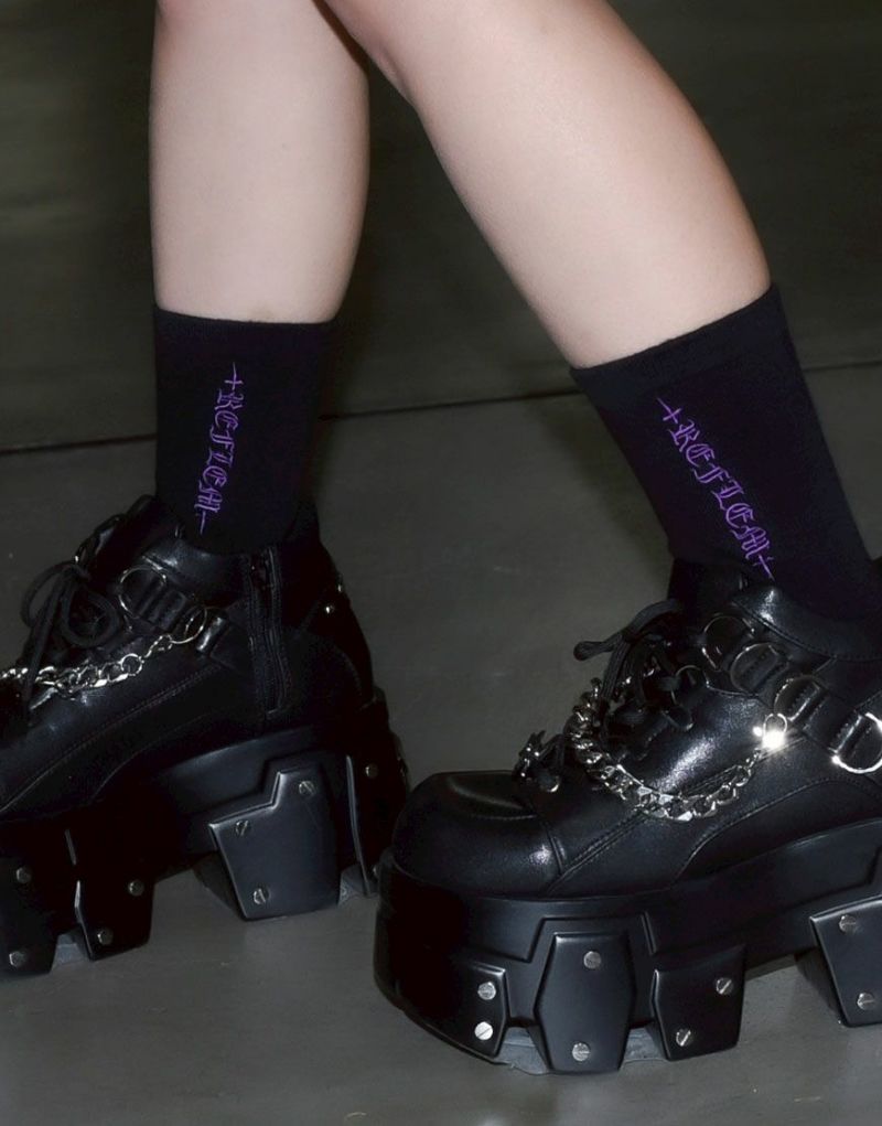 Available in four colors: white and black, black and white, black and purple, and charcoal, these socks are perfect for matching your style and mood. These socks are unisex, making them a great gift or a perfect pairing.