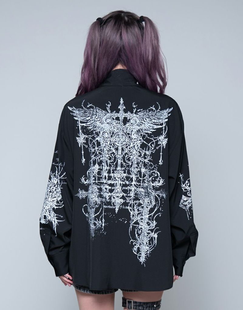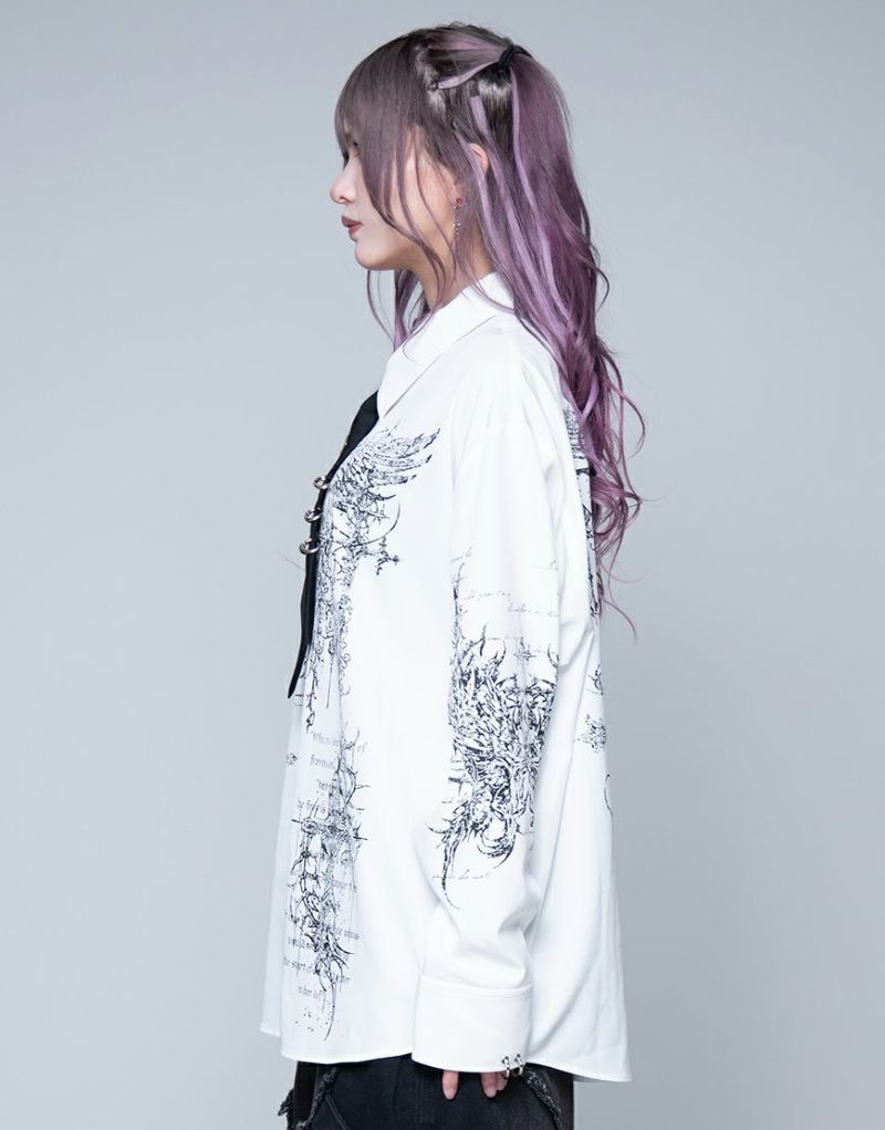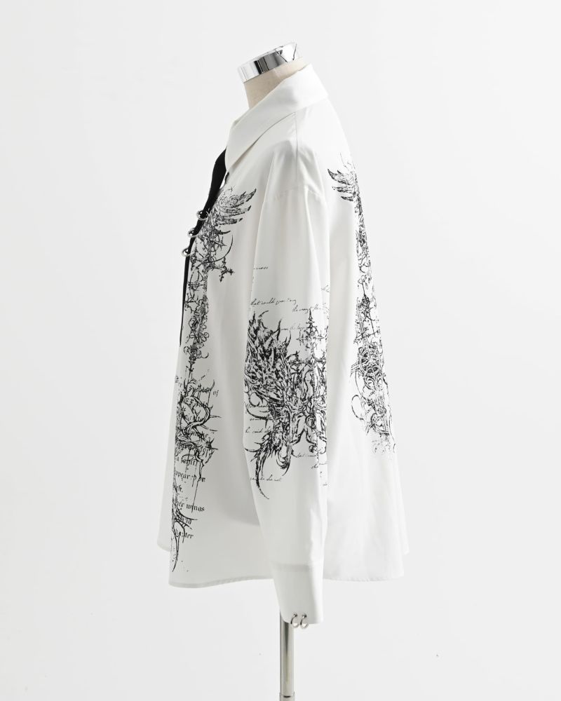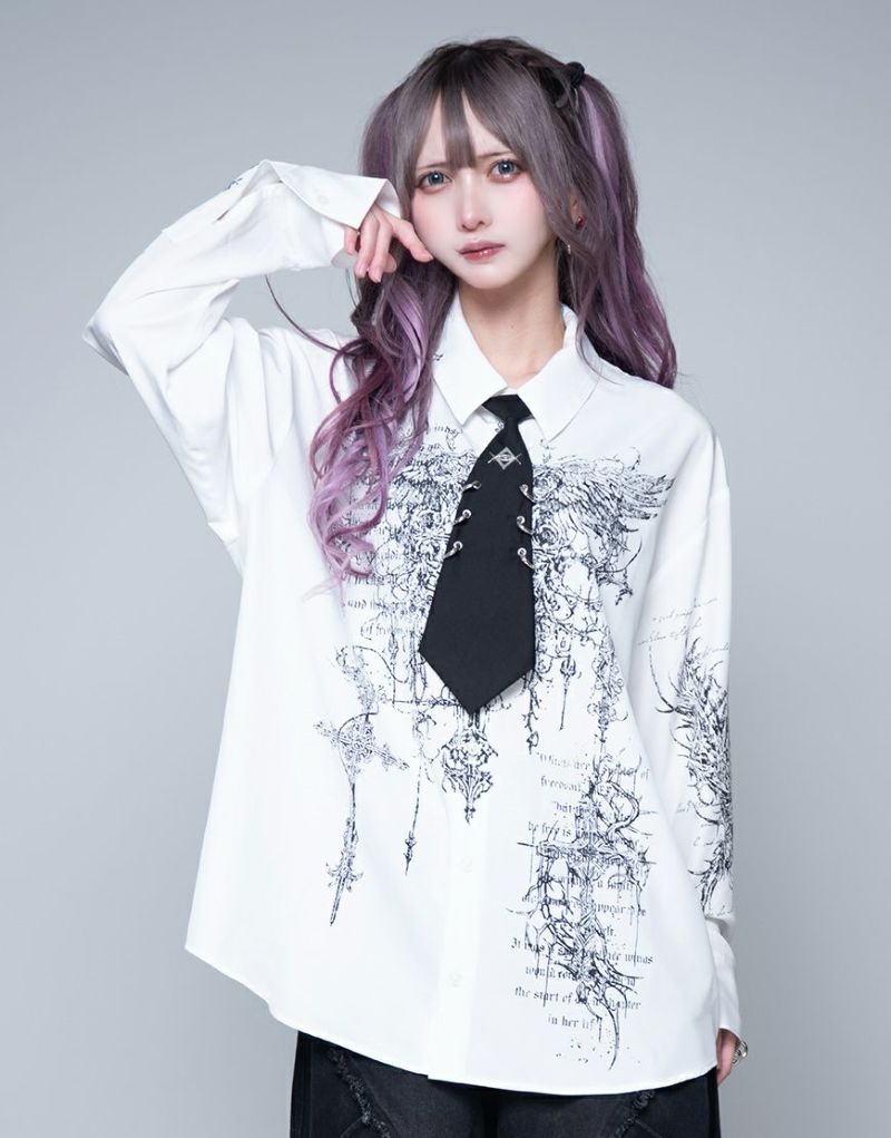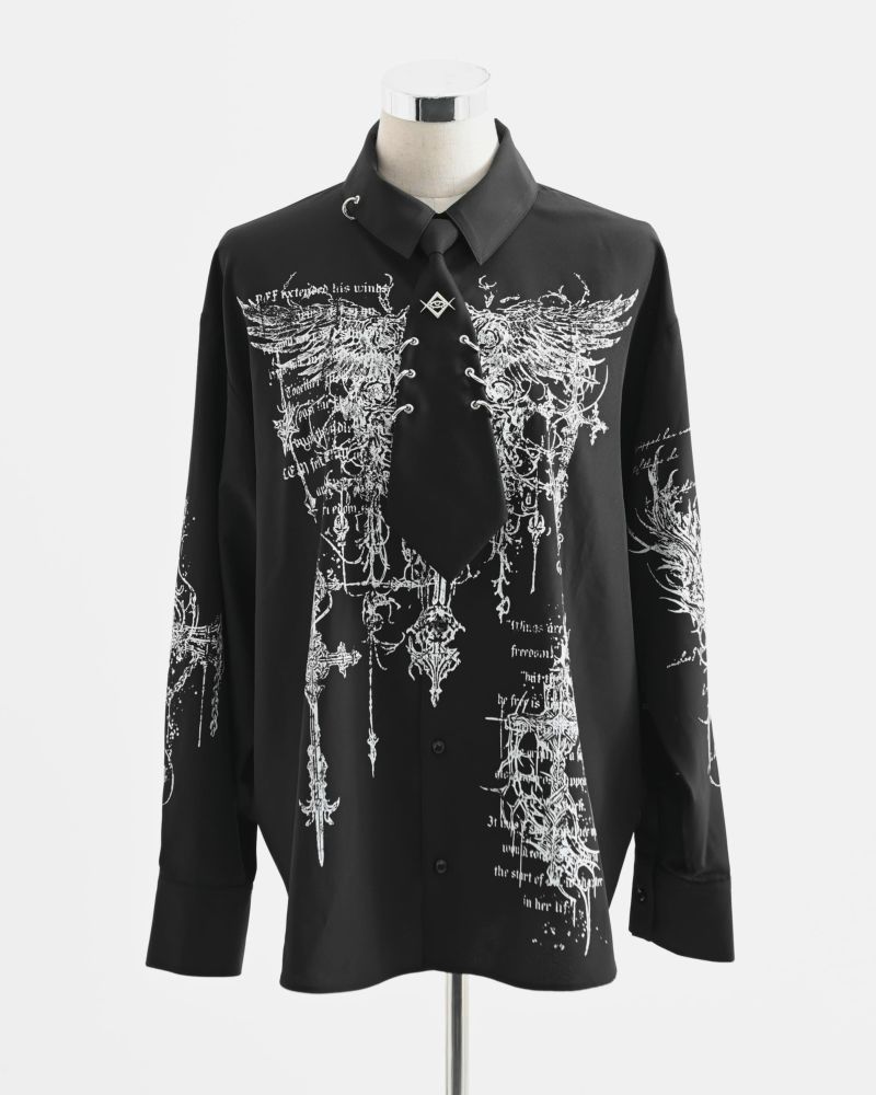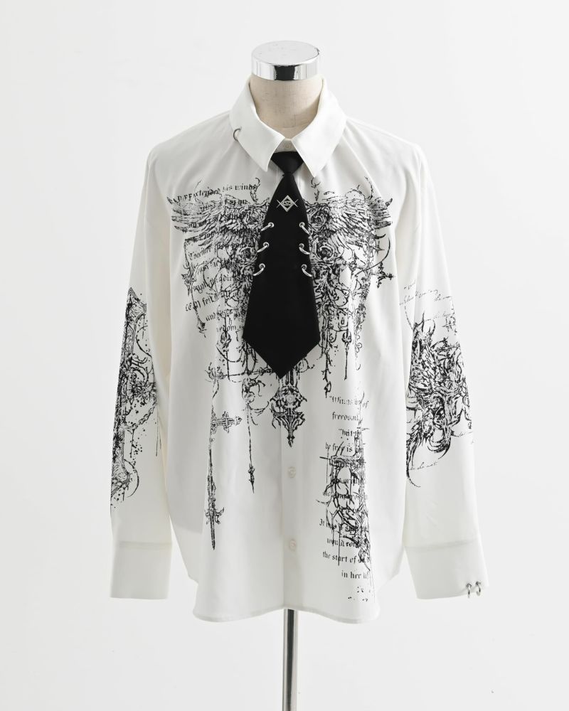 ShirtsREFLEM presents this long-sleeved shirt with a printed tie, showcasing a gothic x grunge aesthetic.
