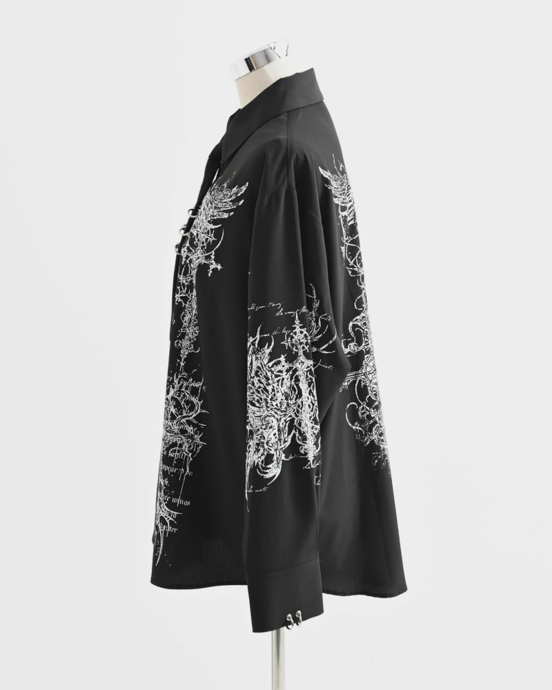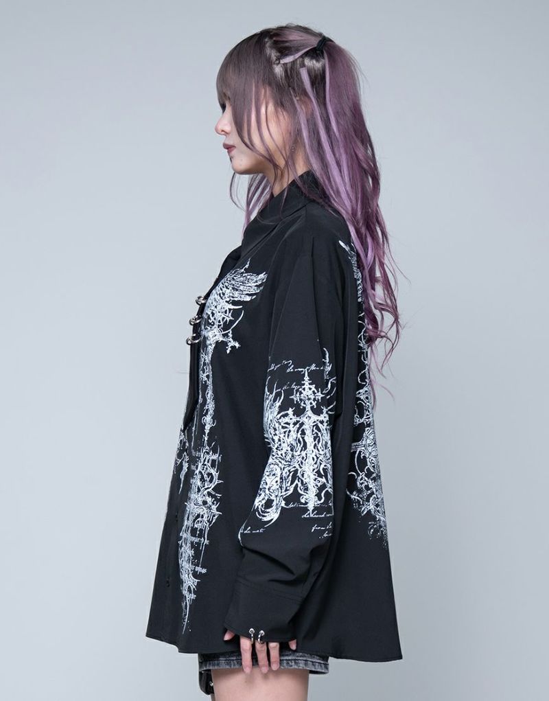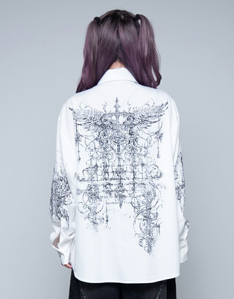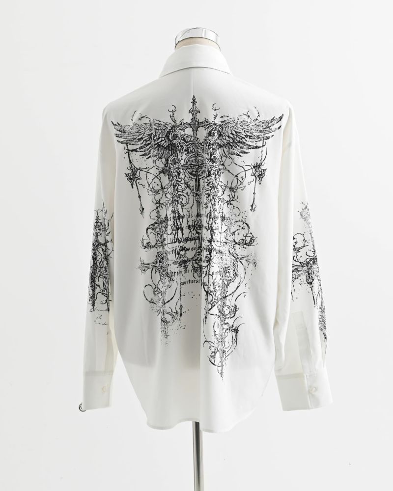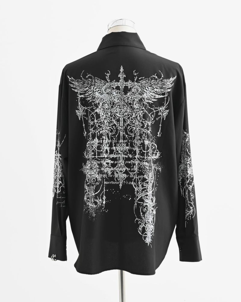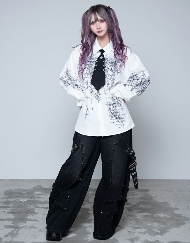 ShirtsREFLEM presents this long-sleeved shirt with a printed tie, showcasing a gothic x grunge aesthetic.