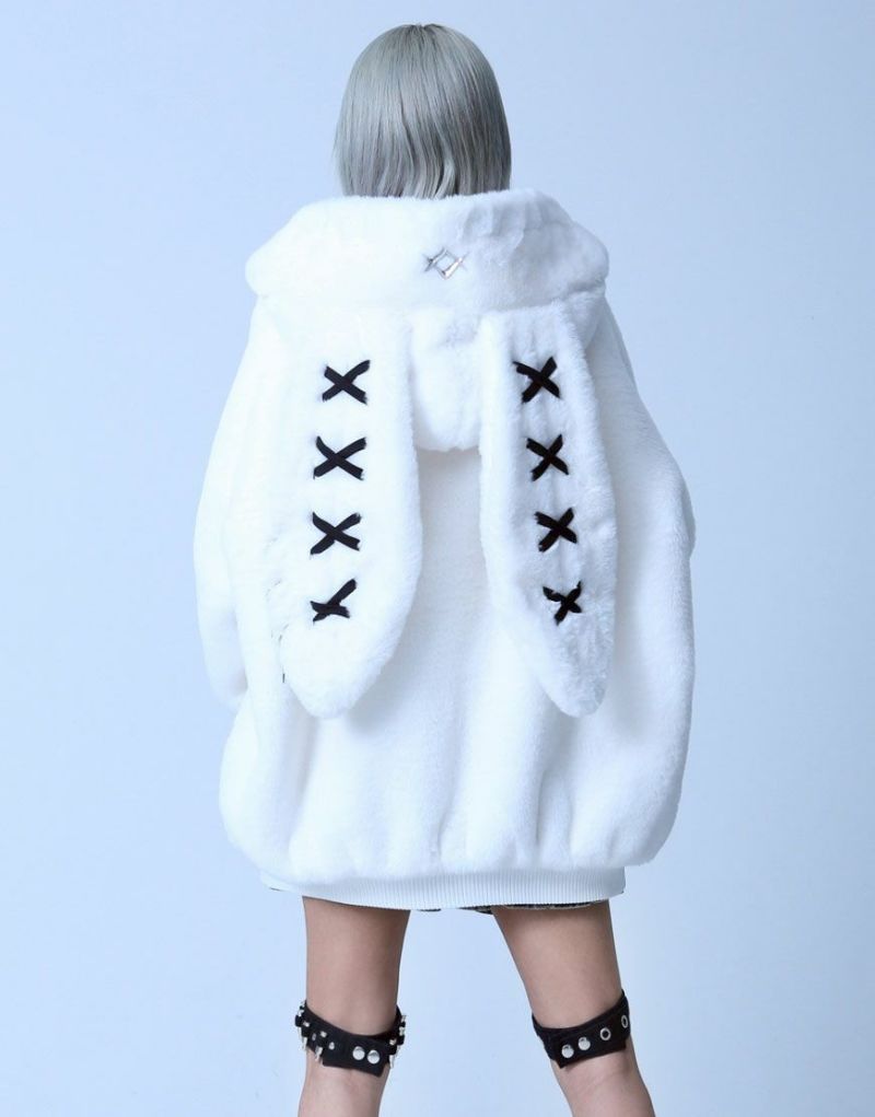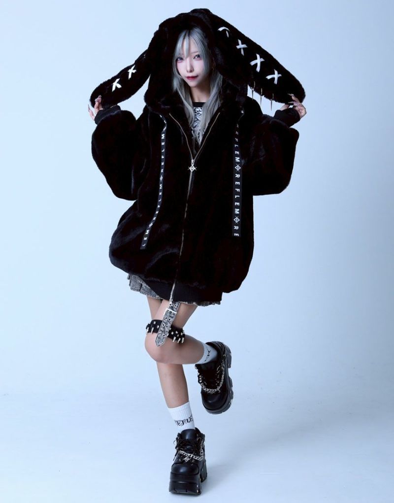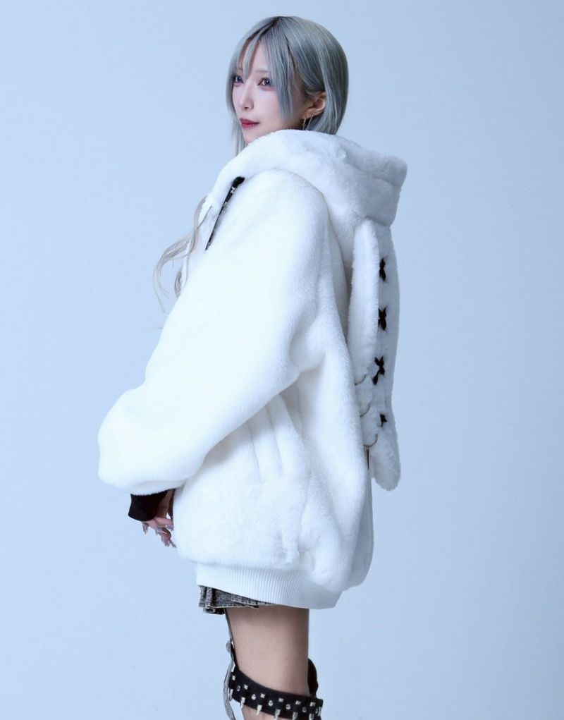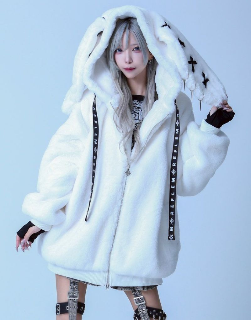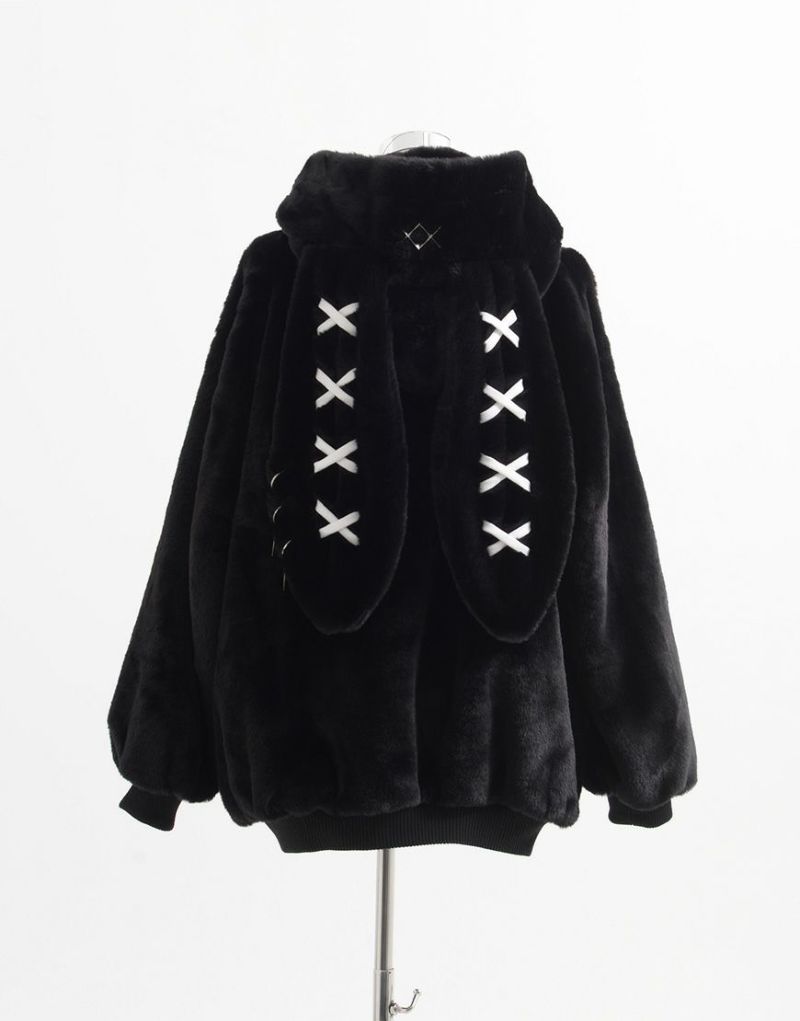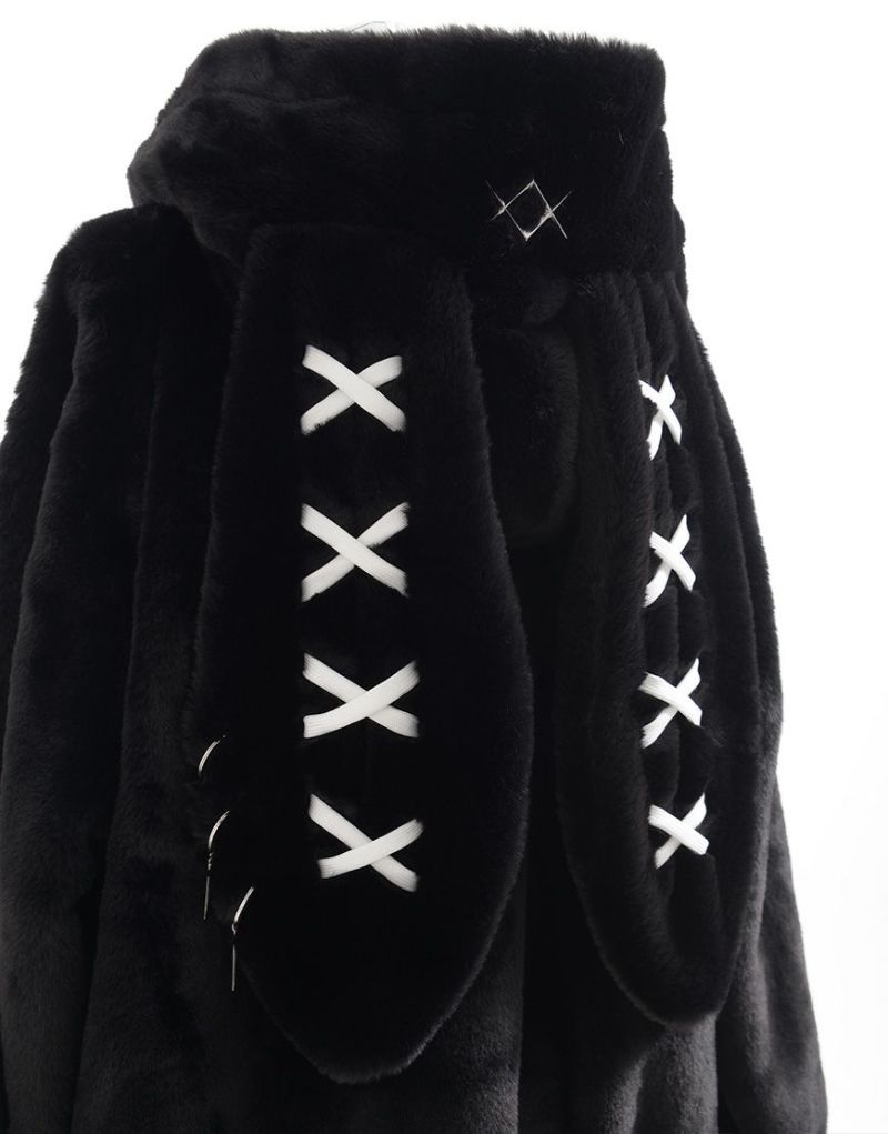 Crafted from voluminous faux fur, it offers a soft, cozy feel. An update from last year’s model, it now features a double zipper and an original pull tab featuring the brand logo. Rivets on the hood further enhance the design, showcasing attention to detail. The striking bunny ears feature a black ribbon cross design, while accessory parts add a touch of individuality.