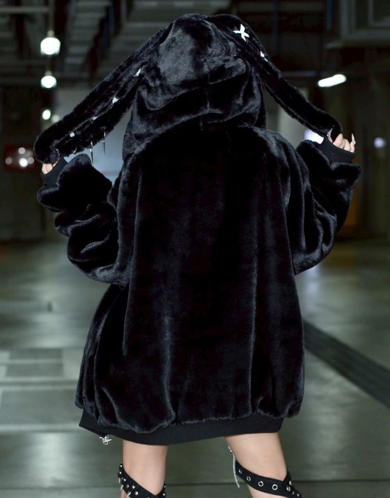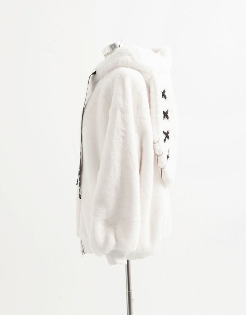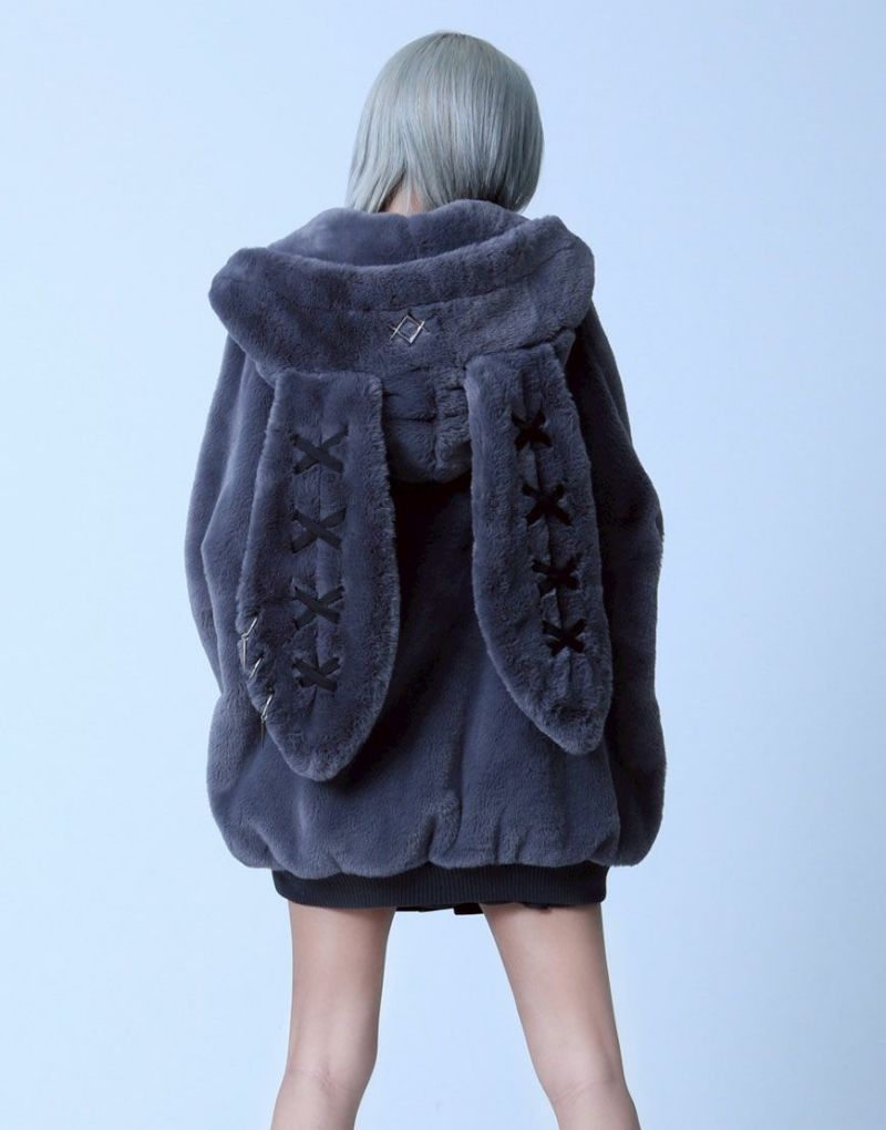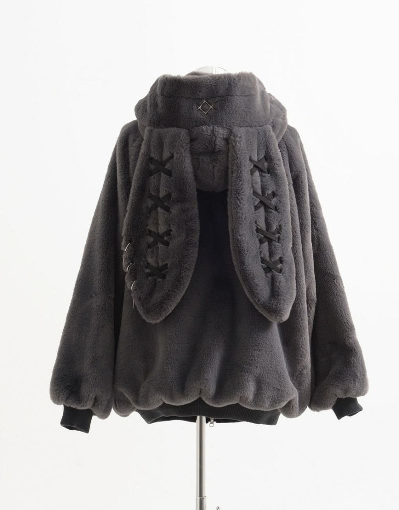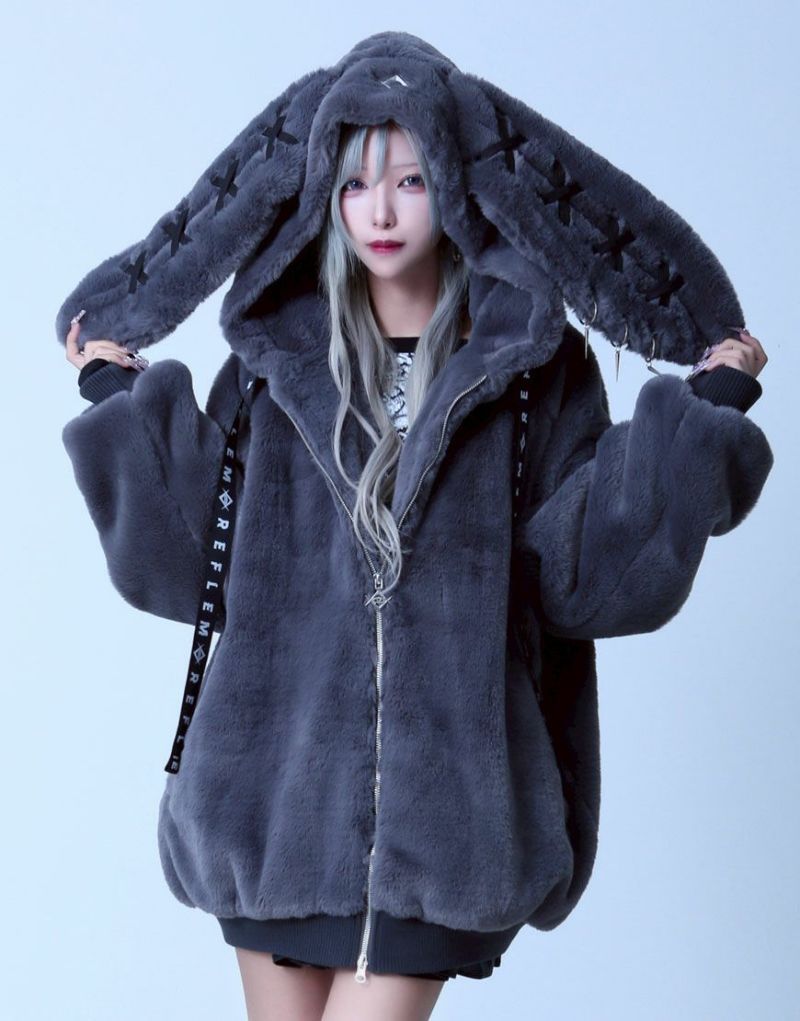 Crafted from voluminous faux fur, it offers a soft, cozy feel. An update from last year’s model, it now features a double zipper and an original pull tab featuring the brand logo. Rivets on the hood further enhance the design, showcasing attention to detail. The striking bunny ears feature a black ribbon cross design, while accessory parts add a touch of individuality.