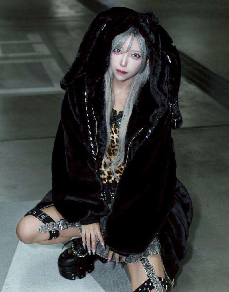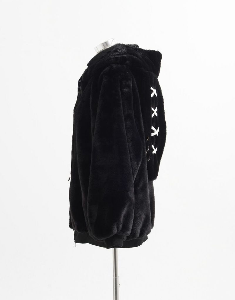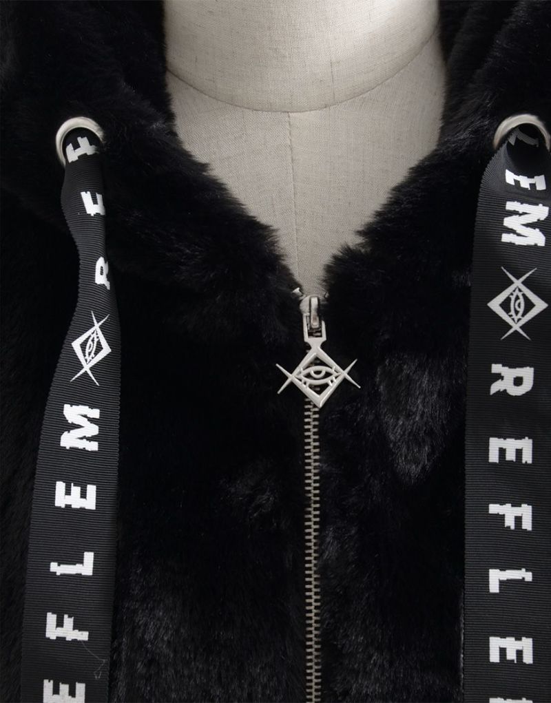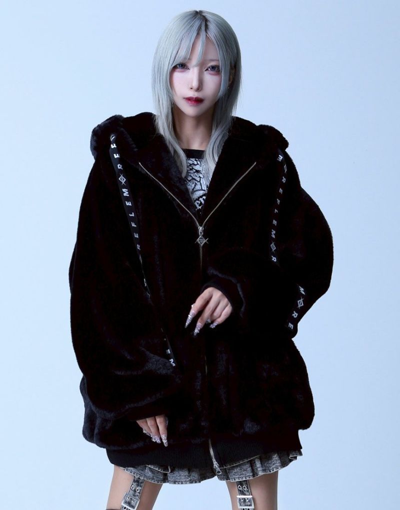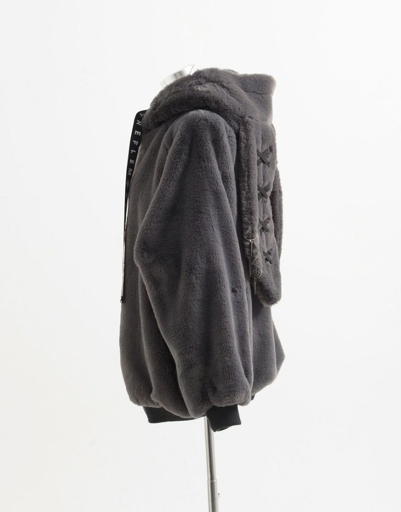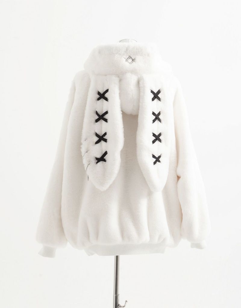 Crafted from voluminous faux fur, it offers a soft, cozy feel. An update from last year’s model, it now features a double zipper and an original pull tab featuring the brand logo. Rivets on the hood further enhance the design, showcasing attention to detail. The striking bunny ears feature a black ribbon cross design, while accessory parts add a touch of individuality.