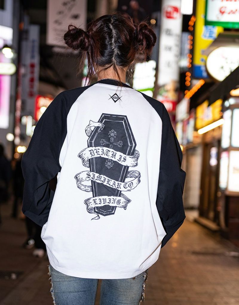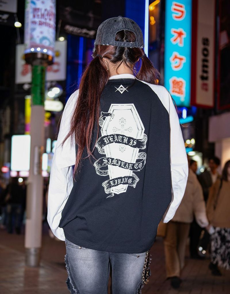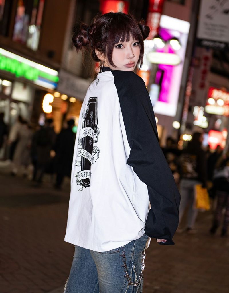 In addition to the eye-catching pierced earrings, impactful lettering and coffin graphics are printed on the front and back.