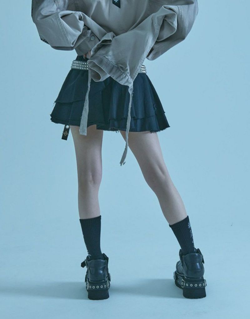 The skirt is layered with three pieces of different lengths and shapes. The decorative piece hanging from the waist features a logo charm.