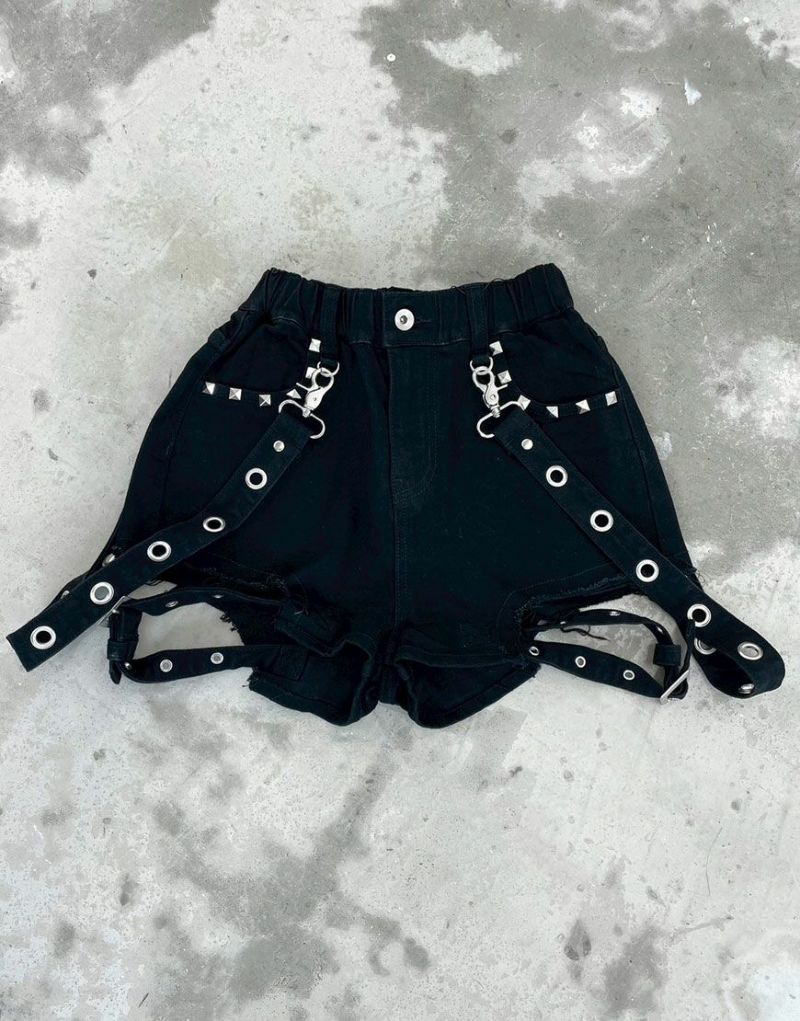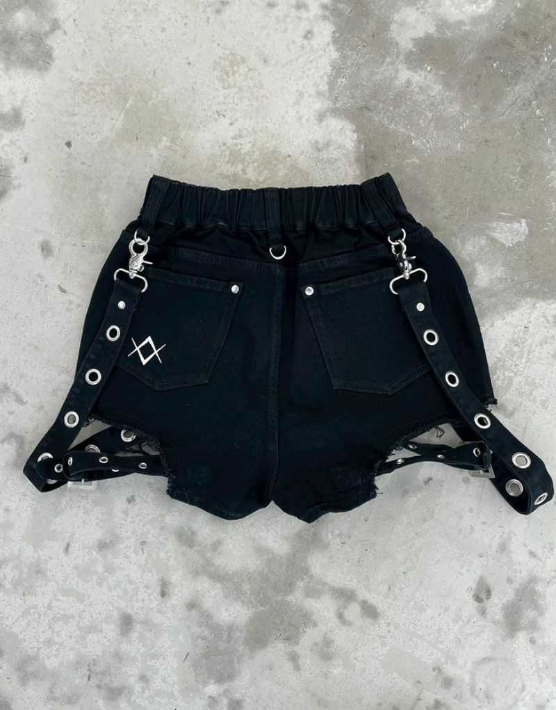 SkirtsREFLEM’s new studded denim shorts with side belts are now available.