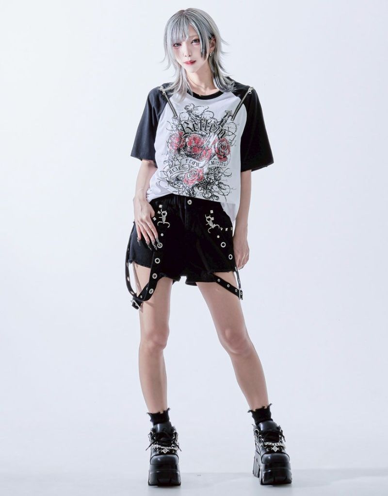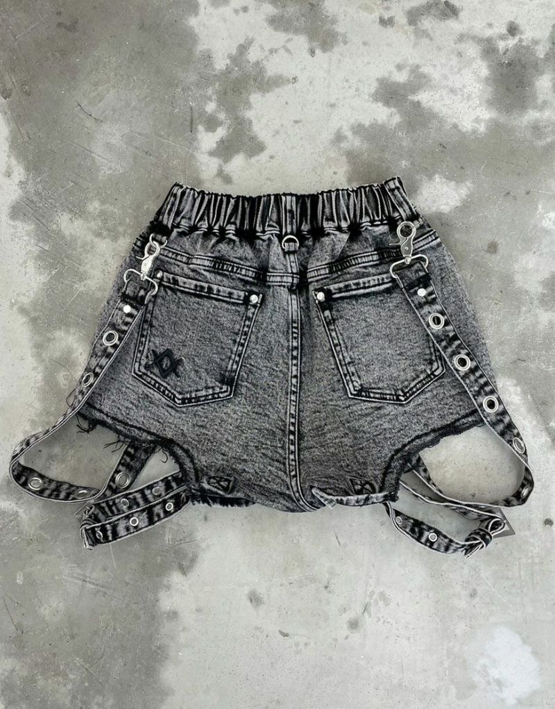 These eye-catching details create a unique look. Crafted from stretchy denim, they offer both ease of movement and a flattering silhouette. The hemline is boldly distressed, with a bold, hollowed-out look, and the sides feature eye-catching suspender belts.
